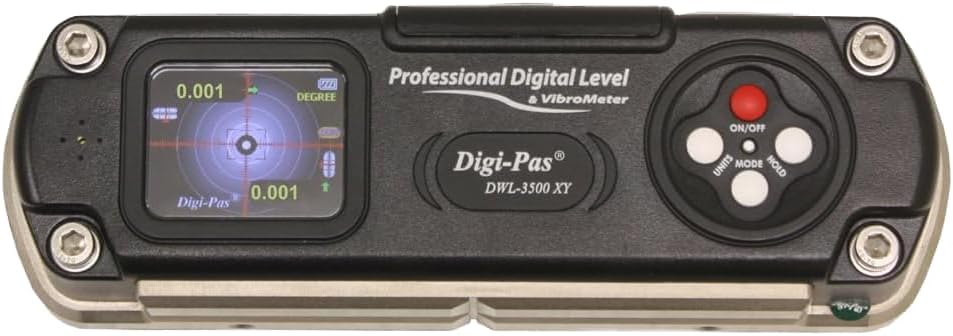 Product Description Digi-Pas DWL3500XY is a 0.001-Degree resolution dual axis precision digital master machinist level with built-in vibrometer designed for industrial users and professionals. The DWL3500XY allows users to obtain both X and Y axis leveling simultaneously through digital numerical and color graphic readouts. The remote measuring and dual axis capabilities greatly reduces installation, setup and maintenance time for precision machines, test and measurement equipment compared to the use of traditional machinists spirit levels. The DWL3500XY device can be easily connected to a PC via USB which will enable real-time remote measurement on angles, vibration data acquisition and analysis. A basic software is included with every unit while a full professional software version is available separately. The built-in vibrometer helps to determine the extent of vibration tolerable by each machine during operation. The DWL3500XY product accuracy is verified by accredited 3rd party calibration and test service providers in USA, Japan, UK and Germany to conform with NIST, JIS, UKAS and DIN under ILAC and A2LA. Digi-Pas products are built with advanced digital MEMS technology, precisely calibrated and temperature compensated to withstand stringent operating environments. Digi-Pas digital levels are manufactured in ISO9001:2000, ISO14001:2000 and OHSAS 18001:2007 accredited facilities and certified by TÜV SÜD and SGS to comply with CE, FCC, C-Tick and RoHS standards. From the Manufacturer Digi-Pas DWL3500XY-USB is a Dual-Axis MASTER Precision Level, Digital Inclinometer of 0.0002”/ft or 5-second (0.02mm/m or 0.001°) sensitivity designed for industrial users & professionals. Operating temp. range: 10° to 120°F. SIMULTANEOUSLY read both X & Y axis levelling status via Bluetooth or USB cable while adjusting footings of precision machines/equipment. This greatly CUTDOWN installation, setup & maintenance TIME effortlessly (one-man operation) and improve QUALITY. Digi-Pas 2-axis Digital Level is highly precise. ACCURACY performance to specification has been verified by accredited 3rd party calibration laboratories & test bodies in US, Japan & Germany in accordance with ISO/IEC 17025:2005 and/or ANSI/NCSL Z540-1 standard, traceable to NIST, JIS & DIN. To purchase an unit accompanied with NIST-traceable calibration certificate with data, please visit our website for reference sample certificates and contact our sales support team. For over a decade, granted with USPTO patents, Digi-Pas 2-axis Smart Machinist Level utilizing advanced MEMS technology has proven to effectively replace traditional single-axis spirit vial levels. Its premium models of high-precision intelligent levelling instruments DWL8500XY have been widely used by some of the world’s most technologically advanced companies, research laboratories and government institutions all over the world. Effective APPLICATIONS for INSTALLATION, SETUP and MAINTENANCE of precision CNC machines, Vision Measurement equipment, CT Scan and MRI equipment, Automotive & Semiconductor Manufacturing equipment, Precision Engineering machinery etc.
