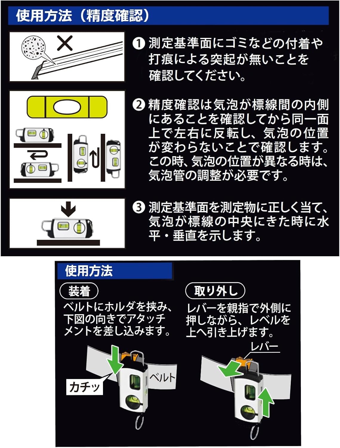 For horizontal and vertical measurements, scaffolding, etc. It has a strong magnet, so it will not fall off even if you have a hammer. Includes carabiner hook and rope ring to prevent falling. Comes with a one-touch holder for attaching a belt. Comes with 360° bubble tube for simple measuring. Comes with phosphorescent tape underneath the bubble tube, which is convenient for use in dark places. V-grooved measuring surface allows for measuring pipes and other round items.