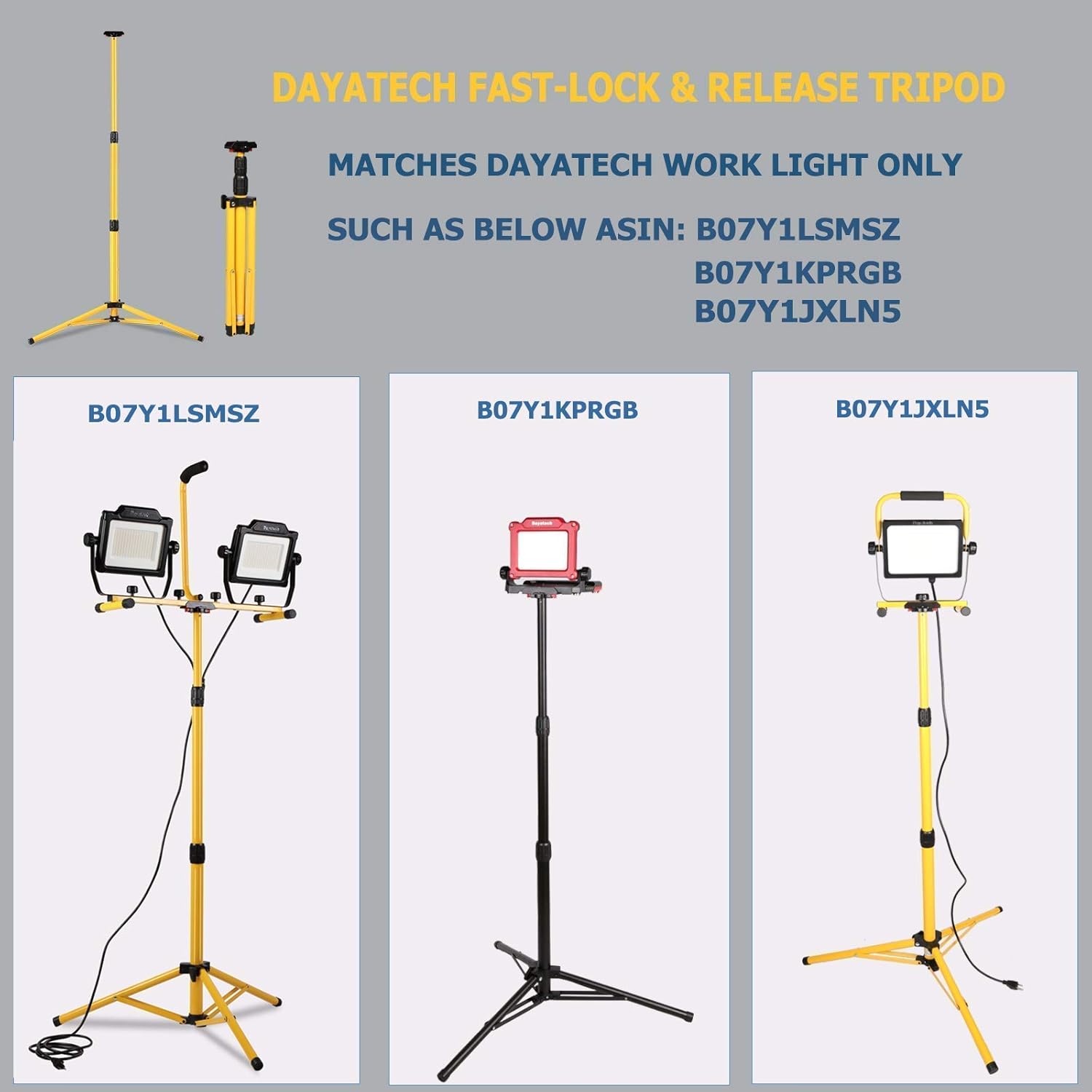 Color: Yellow and BlackMaterial: Steel, Aluminium,ABS with NylonHeight Adjustment: 27" to 59" (89-150cm)Weight: 4.18lbsPackage Contents: 1x Tripod Stand with fast-lock & release bracket Triangle support, with anti-slip foot cover, the stand is super stable and ensures lighting safety Sturdy three legged design for maximum stability It's suitable for many types of DAYATECH work lights (Not Included and sold separately) which can be used for indoor and outdoor jobsite such as garage,greenhouses, workshop,construction site, garden,lawn,camping,emergency etc .Strong Structure: Big Diameter and thick steel Pole and Triangle feet support with anti-slip foot caps, the stand is super stable and ensures lighting safety Load capacity 22 lbs when evenly distributed The strong metal legs are made for durability, and fold up easily to clip into place