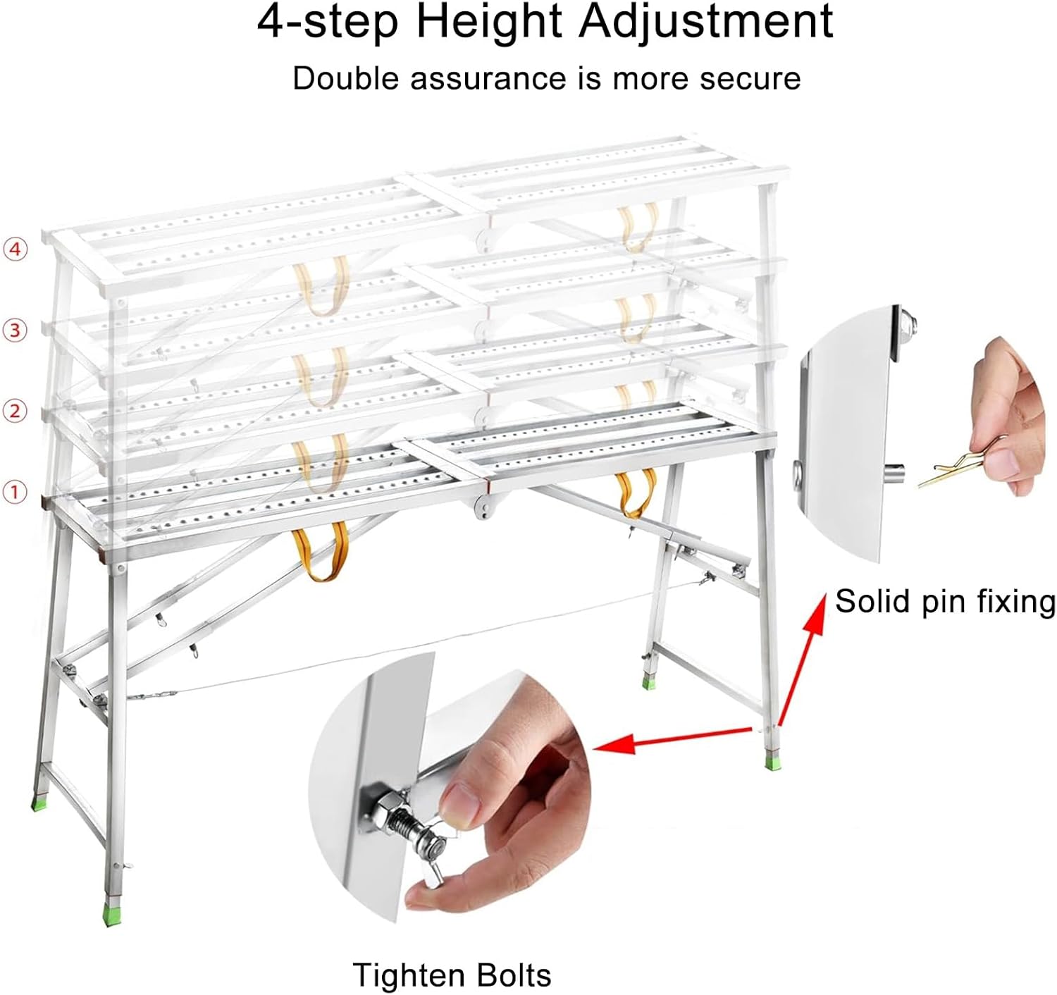 New and unique design incorporates the various functions of scaffolding and step ladders, portable folding scaffolding equipment, adjustable height multipurpose work platform not only great for washing vehicles but also ideal for painting the wall, cleaning windows. It can also help you access those just out of arm's reach items in the cupboard or used as a table for picnics.Details:Durable Structure: Working platform is made of thickened galvanized steel, and the double pole support can bear 880lbs.Reinforced Hinge: Two sturdy hinges keep the countertop flat and not easy to break, allowing for smooth folding and unfolding, and ensuring stable and safe use.Carrying Handles: Two durable nylon carrying handles allow you to easily take it to different working places, saving effort.Specification:Name: Adjustable Work Platform LadderColor: SilverMaterial: Galvanized steel pipeLoading Capacity: 400kg/880lbsProduct Size:- 140cm/4.59ft: 120 x 40 x 70~110cm- 180cm/5.9ft: 180 x 40 x 90~145cm- 200cm/6.5ft: 200 x 40 x 100~160cmProduct Use: Home decoration, DIY, holding high things, painting walls, general maintenance work.Package:1 x Folding ScaffoldingAfter-sales Service:Reminder: Since the scaffold is welded by galvanized steel, there will be welding marks.This is inevitable.Due to manual measurement, please allow 1-10mm deviation.Due to the light and screen difference, the product's color may be slightly different from the picture.