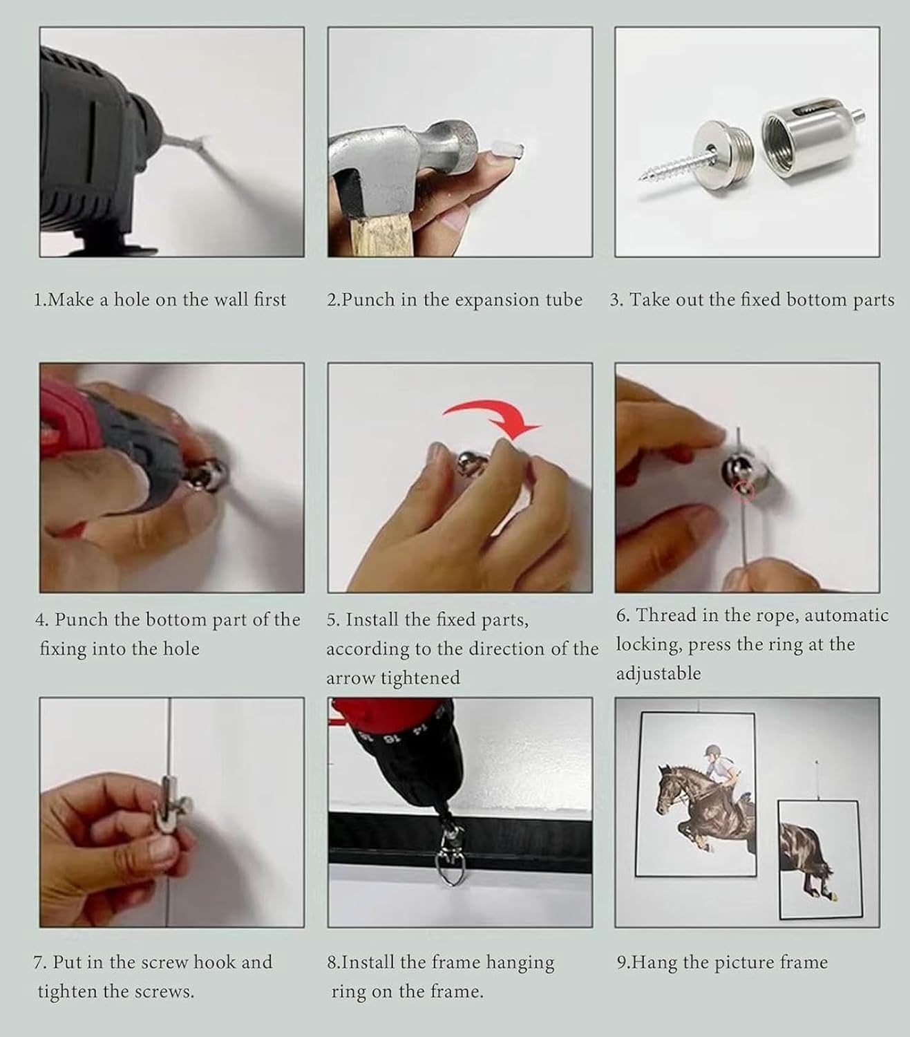 Unleash the evolutionary potential of each artwork's layout; hang more frames and say goodbye to worries! Create stunning art displays on your walls! 【Packaging Information】- Track- All necessary accessories【Specifications】- Material: Zinc alloy- Wire: Transparent nylon wire, steel wire- Wire length: 0.5m (19.6 inches), 1m (39.4 inches), 1.5m (59 inches), 2m (78.7 inches), 2.5m (98.4 inches), 3.0m (118 inches)- We only provide the track, not the artwork! 【Features】- Safe and professional image display. - We only provide the track, not the artwork! - Strong load-bearing capacity, not easily bent. - Flexible positioning, will not damage the wall. - Multiple hooks can be easily installed on each rope, and it can be adjusted up and down. - Multiple picture frames can be hung simultaneously for easy storage and organization. 【Friendly Reminder】- Due to manual measurement, there may be an error of 0-3 cm. Please understand. - Please note that due to different monitors, there may be slight color differences. Please understand.