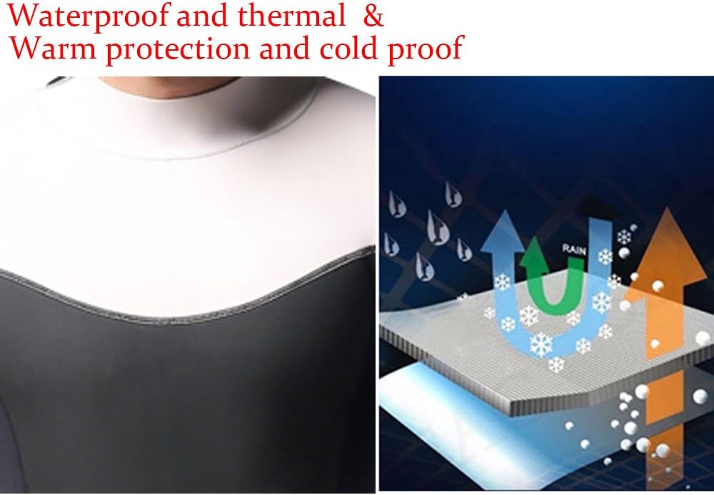 Size: (Unit: Inch; Lb) S Bust: 34.64, Waist: 29.92, Hip: 32.28, thigh:18.89, Height: 65-67, weight:110-112; M Bust: 36.22, Waist: 31.49, Hip: 33.85, thigh:19.68, Height: 66-69, weight:132-148; L Bust: 37.79, Waist: 33.07, Hip: 35.43, thigh:20.47, Height: 68-70, weight:143-165; XL Bust: 39.37, Waist: 34.64, Hip: 37.00, thigh:21.25, Height: 70-73, weight:165-198; XXL Bust: 40.94, Waist: 36.22, Hip: 38.58, thigh:22.04, Height: 73-75, weight:198-209; The most important things to choose a websuit from is fit,if not,the diving suit not only couldn't prevent cold but also scoop water and affect the actions in the water. Considering the underwater temperature and pressure,the diving depth could not exceed 60 meters,even the best diving suits should also be maintained at this depth. Different thickness and suture patterns determine the suitability of the diving suit.This diving suit is 3mm thickness and use Italian environmental friendly materials Neoprene,which is durable,light and breathable,easy to carry and suitable for short diving.Customers who have great need warmth and long time diving are advised to buy a thicker wetsuit. This wetsuit provides UV protection and helps defending against common water irritants and insects. It's High elastic,flatlock stitch,perfectly fit the skin,effectively prevent wear and helps to speed up the diving with no sense of load.