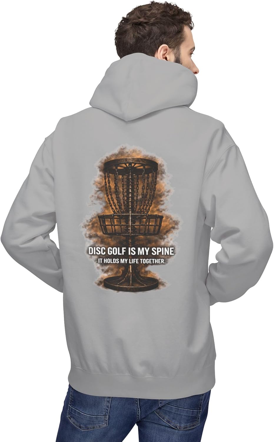 This midweight fleece hoodie carries the quiet pride of time spent on the course. The back print—an artistic, slightly weathered disc-golf basket with the line “DISC GOLF IS MY SPINE” and a subtle distressed texture—reads like a badge of dedication. The relaxed dropped shoulders and roomy pouch pocket make it easy to pull on after a round, warm up between holes, or wear on cool evenings at the clubhouse. The substantial 8.4 oz fabric feels sturdy yet soft against the skin; the two-piece jersey-lined hood adds extra warmth when wind picks up on an open fairway. Ethically made and OEKO-TEX certified, this hoodie fits into a conscious player’s kit: it looks lived-in without sacrificing responsible production. Wear it to practice, post-tourney hangs, or those long drives when you need comfort and a little attitude. Product features - Two-piece jersey-lined hood for extra warmth and structure - Relaxed dropped-shoulder cut for easy layering and movement - Front pouch pocket for warmth and small-item storage - Medium-heavy 8.4 oz fabric with soft ring-spun cotton face - OEKO-TEX + socially conscious (FLA & WRAP) certified manufacturing Care instructions - Machine wash: cold (max 30C or 90F), gentle cycle - Non-chlorine: bleach as needed - Tumble dry: low heat - Iron, steam or dry: low heat - Do not dryclean