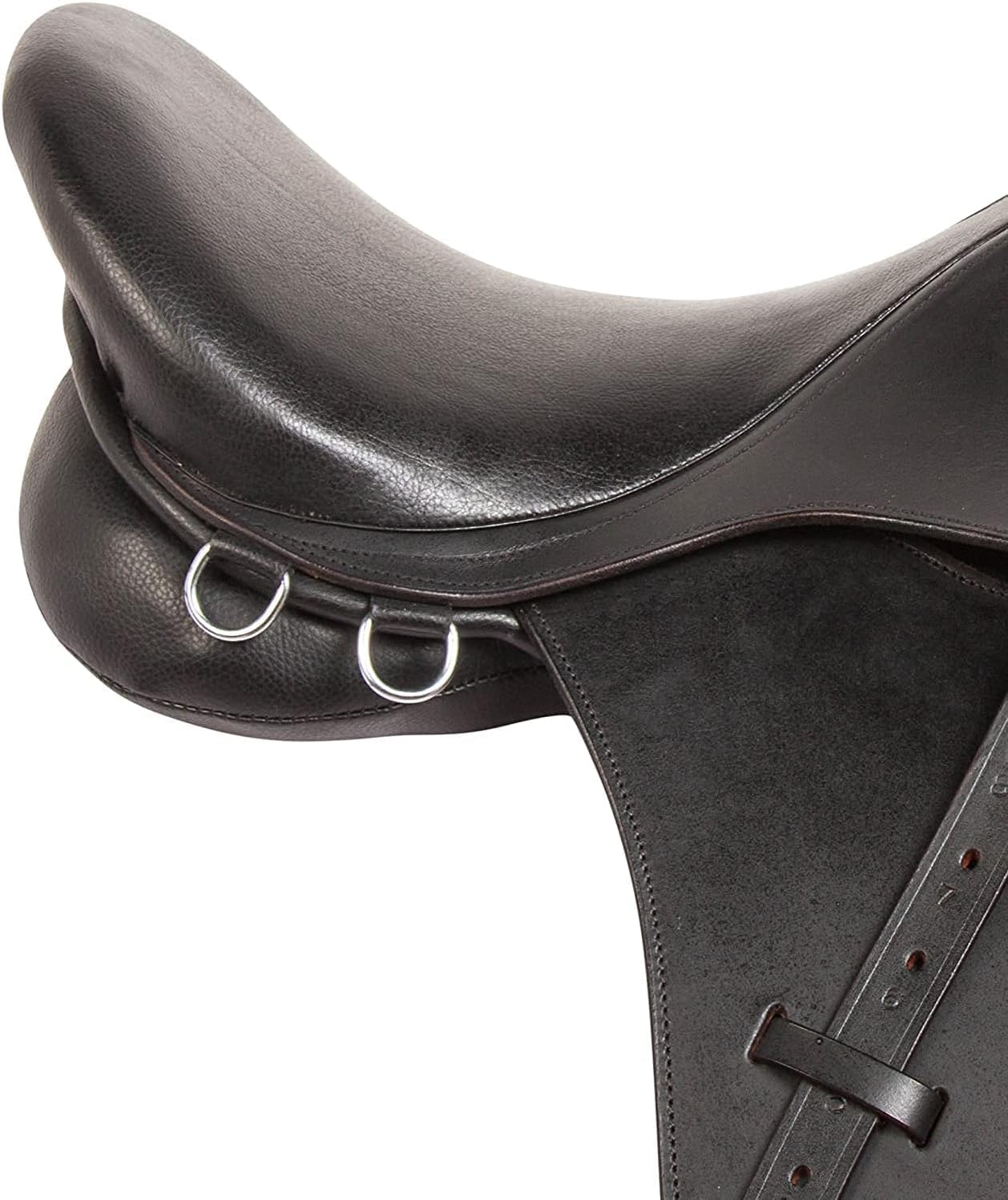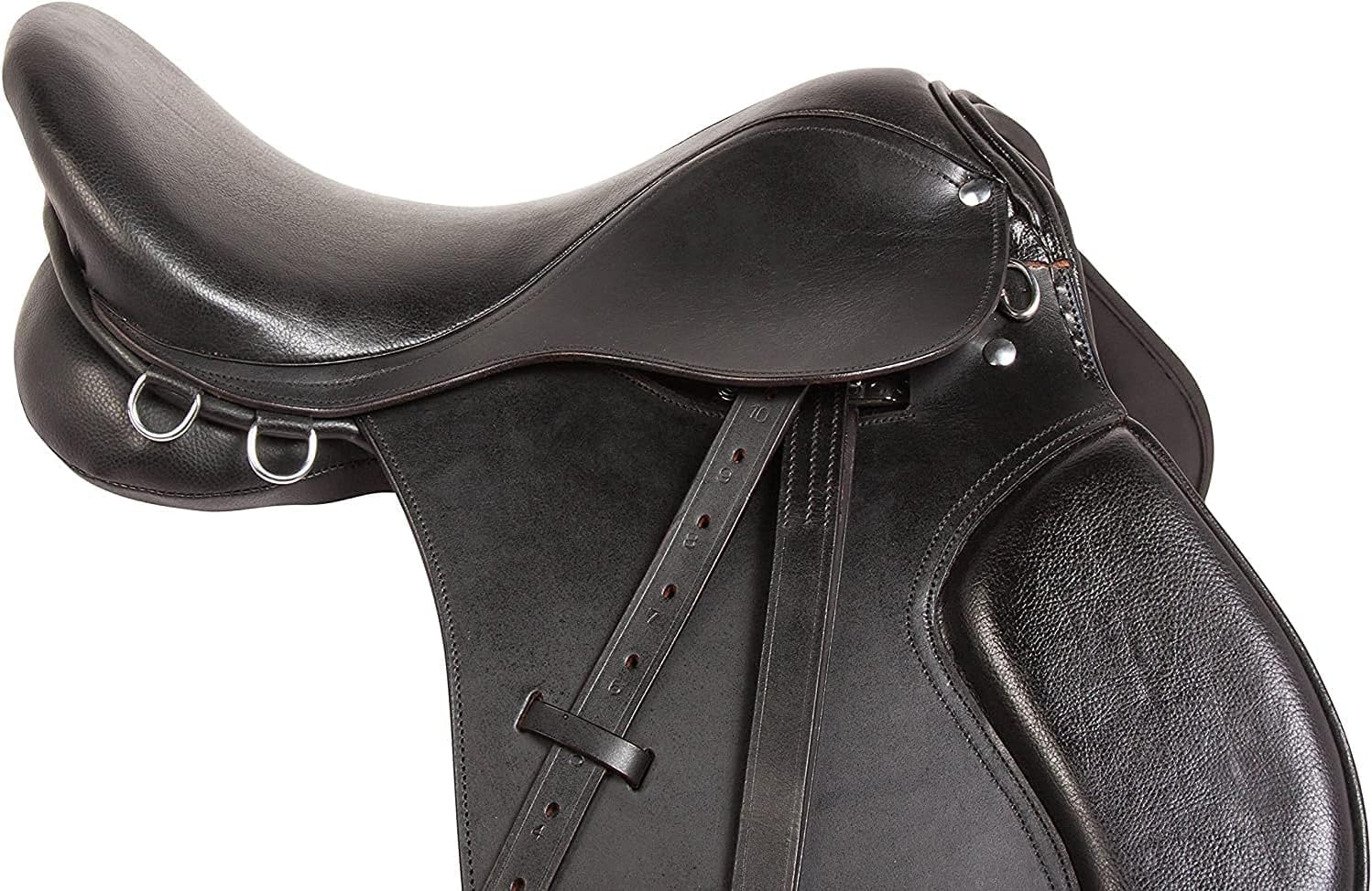 All Purpose Black Premium Leather English Riding Horse Saddle Starter KIT 15 16 17 18 This all purpose starter saddle allows the rider to experience many different english disciplines without spending a fortune. Helps rider develop a secure and balanced seat with concealed knee rolls, padded flaps, and a medium-deep padded seat. This saddle is perfect for riders to work on equitation, and with the padded panels it is also comfortable for the horse. The high cantle and longer flaps makes this suitable for flat work, but the saddle also offers a lower pommel and slightly forward flaps for riders wishing to jump. Multiple D-Rings are great for attaching saddle bags and straps while hacking on the trail. Saddle Specs: Color: Black Deep Padded leather seat Padded Knee rolls Stirrup Leathers Stirrup Irons For Wholesale inquiries, contact us