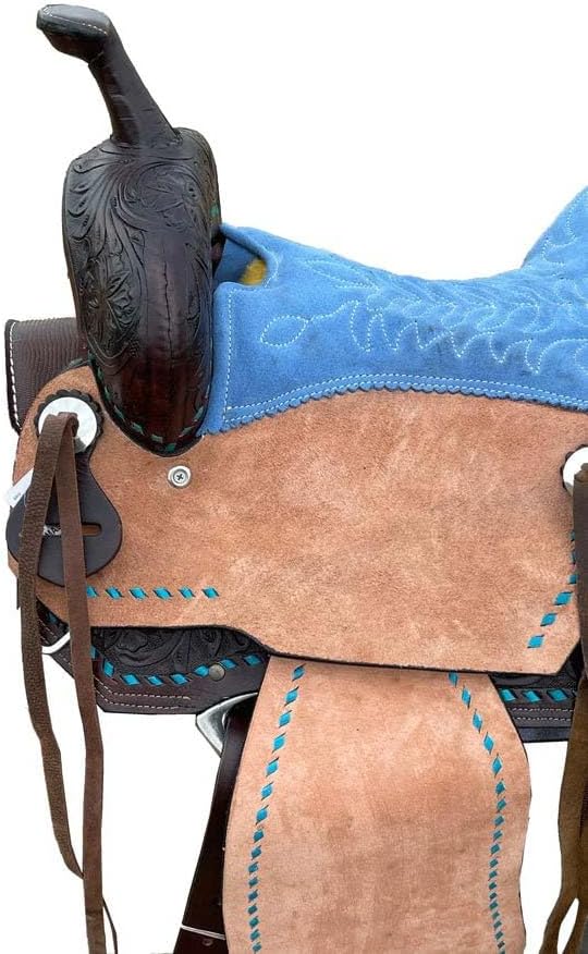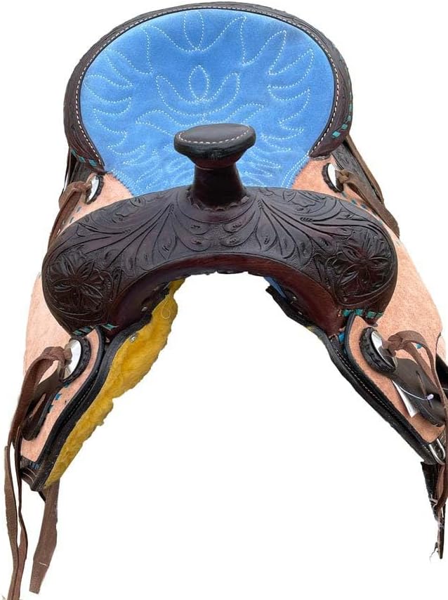 Saddles are an essential piece of equipment for any equestrian, providing the crucial connection between rider and horse. Crafted with care and precision, a high-quality saddle offers comfort, support, and control for both the rider and the animal. Whether you're a seasoned competitor or a casual trail rider, finding the right saddle can make all the difference in your riding experience. With a wide range of styles and materials available, from classic English to rugged Western designs, there's a saddle to suit every discipline and preference. Invest in a well-made saddle, and you'll enjoy countless hours of enjoyable and secure riding adventures. ***Girth Cinch, Back Cinch, Saddle Pad and Horse Bit NOT INCLUDED*** This saddle features a beautiful premium leather with a classic hand carved fern leaf and basket weave tooling. It also features numerous ties with silver Conchos for easy accessory attachment, and padded ergonomic stirrups for optimum rider comfort. This saddle also features our new high-tech close contact skirt for enhanced horse and rider communication. The suede seat is well-padded and features a decorative quilt stitched pattern while the underside has a well-padded fleece underside for horse’s comfort. 100% Premium Leather Hand Carved Fern & Basket Tooling Quilt Stitched Padded Suede Seat Padded Ergonomic Stirrups Numerous Ties For Accessory Attachment Shiny Silver Sun Conchos Well-Padded Fleece Underside Well Balanced Fiberglass Tree Saddle. Saddle Specifications:- Color: As Per Picture Pony Saddle Measurements:- Size: 10-12 inches Seat. Gullet: 5 FQHB. Skirt: 22-25. Horn: 2.5. Swell: 10. Cantle: 3.5. Stirrups: 26-35. Weight: 18 to 22 lbs. Adult Saddle Measurements:- Size: 14-18 inches Seat. Gullet: 7 FQHB. Skirt: 25-28. Horn: 3.5. Swell: 12. Cantle: 4. Stirrups: 30-40. Weight: 22-26 lbs.