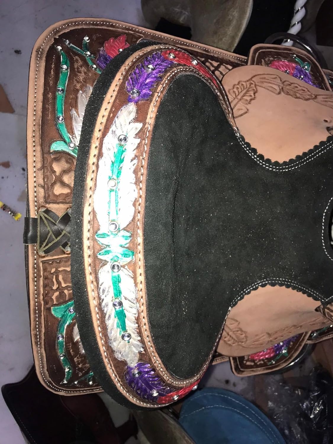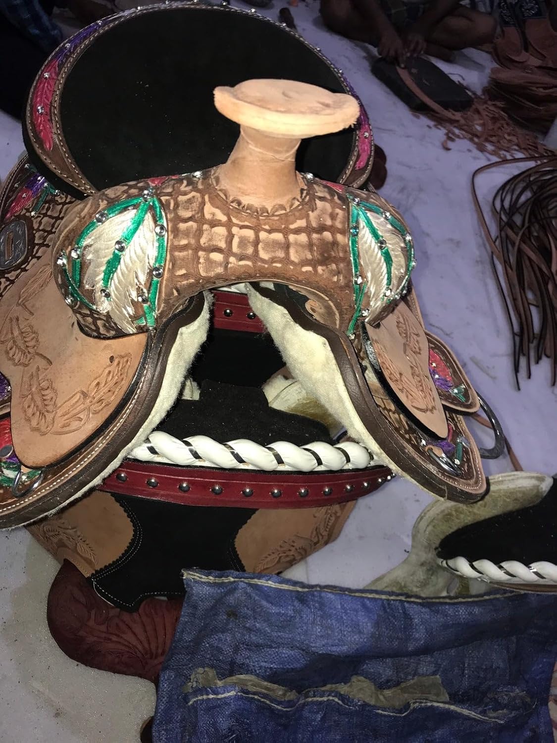 Experience the timeless beauty and craftsmanship of a genuine saddle. Meticulously handcrafted from premium leather, this saddle is designed to provide both rider and horse with exceptional comfort and support. The high-quality materials and attention to detail ensure durability, while the classic styling adds an elegant touch to any equestrian pursuit. Whether you're a seasoned rider or just starting out, this saddle promises a secure and enjoyable ride. With proper care and maintenance, it will become a cherished companion on your adventures for years to come. Elevate your riding experience with this exquisite saddle. *** Girth Cinch, Back Cinch, Saddle Pad, and Horse Bit NOT INCLUDED * Saddle Specifications:- Material: Leather. Colour: As Per Picture. Size: 8" inches Seat. Horn - 2" Weight - 6 lbs (approx.) Skirt - 14" x 15" Tree - 3 1/2" Gullet Stirrups Size - 3" Wide, 1 1/2" Thread Stirrups Range 15"- 22" Measurement is from center of seat to the bottom of the stirrup. It can also be adjusted to fit your child better by making additional holes.