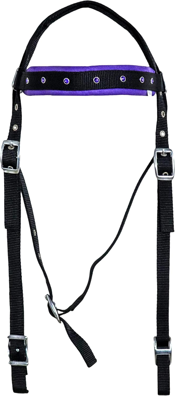 A headstall is an essential piece of tack for Western-style horseback riding. This sturdy headstall is designed to provide maximum control and comfort for your horse during training, trail rides, or competitions. Crafted from high-quality synthetic, it features intricate stitching and decorative accents that add a touch of Western flair. The adjustable noseband and throatlatch ensure a secure yet comfortable fit, while the browband helps distribute pressure evenly across the horse's head. With its durable construction and stylish appearance, this headstall is a practical and fashionable choice for any Western rider. Western Saddle Headstall Breast Collar Reins Horse Tack Set Barrel Racing Crystal Show Synthetic Nylon This nylon tack set is sure to be a perfect addition to your tack collection! This set features crystal accents that add a pop of bling in the show ring. Tack Set Specifications: Double Stitched Nylon Crystal Accents Stainless Steel Hardware Set Includes : Headstall, Breast Collar and reins Sizes Available : Full & Cob