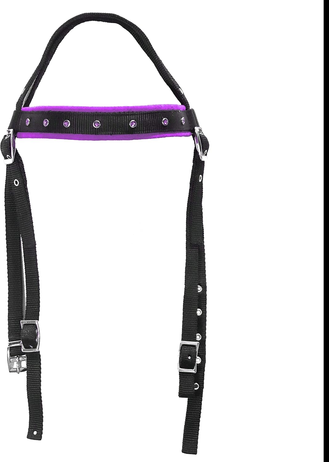 A headstall is an essential piece of tack for Western-style horseback riding. This sturdy headstall is designed to provide maximum control and comfort for your horse during training, trail rides, or competitions. Crafted from high-quality synthetic, it features intricate stitching and decorative accents that add a touch of Western flair. The adjustable noseband and throatlatch ensure a secure yet comfortable fit, while the browband helps distribute pressure evenly across the horse's head. With its durable construction and stylish appearance, this headstall is a practical and fashionable choice for any Western rider. Western Saddle Headstall Breast Collar Reins Horse Tack Set Barrel Racing Crystal Show Synthetic Nylon This nylon tack set is sure to be a perfect addition to your tack collection! This set features crystal accents that add a pop of bling in the show ring. Tack Set Specifications: Double Stitched Nylon Crystal Accents Stainless Steel Hardware Set Includes : Headstall, Breast Collar and reins Sizes Available : Full & Cob
