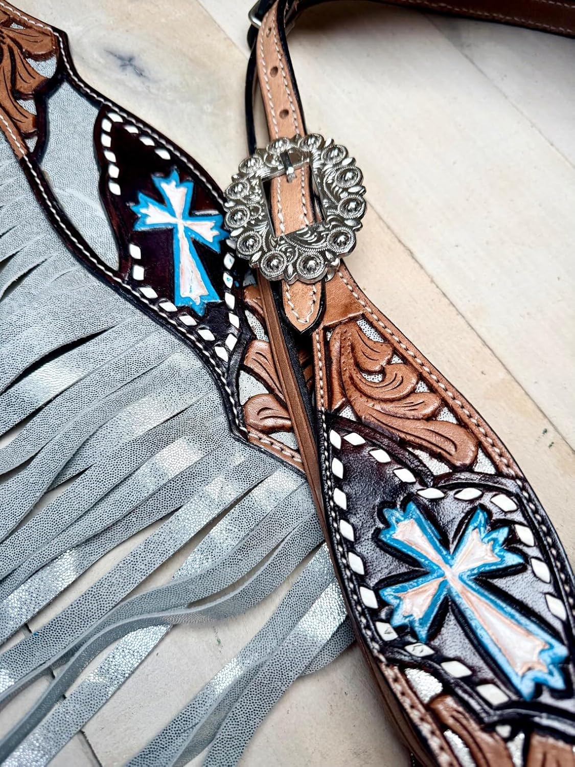 Offering a handcrafted matching set of Headstall and Breast Collar & Reins made with 100% Premium Leather, Adjustable buckle & SS Fitting. Beautiful Headstall Breastplate and Reins :-Our aim is to satisfy the customer by providing the right size and good quality leather saddle. Really make your horse stand out in this gorgeous angel wing tack set! This set features a beautifully hand crafted winged breast collar and headstall that will really help you fly! The set is a hand Tooled Tack Set. The set is intricately tooled and decorated to give it a true winged effect. This set features stainless steel hardware with Chicago screw bits and rein attachments. Tack Set Specifications: Color: As Per Picture. 100% Premium Leather. Hand Carved Tooling. Stainless Steel Hardware. Tack Set Measurements: Full & Cob. Weight: Approx. 4 to 5 lbs.
