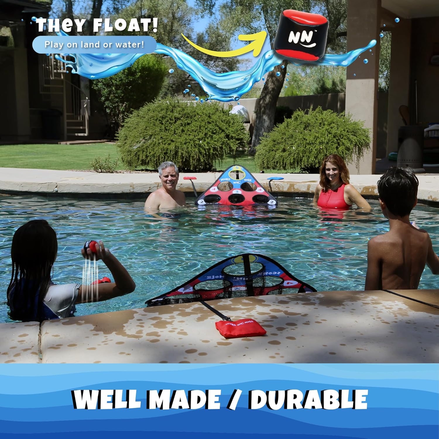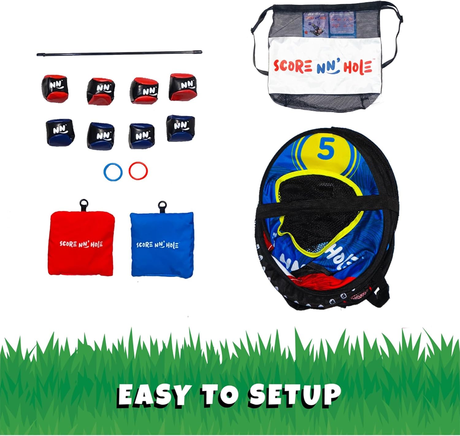 The Toss, Roll, Land, or Water easy to set-up Cornhole Game Play makes this the most versatile cornhole game ever! It's a backyard game that brings together the best of all worlds! Perfect for all ages to play together. Easy to set up, well made, portable, and worth the money for the hours of family fun competitions. Players take turns tossing or rolling hacky balls. Ages 6+ and up. 1-4 Players.