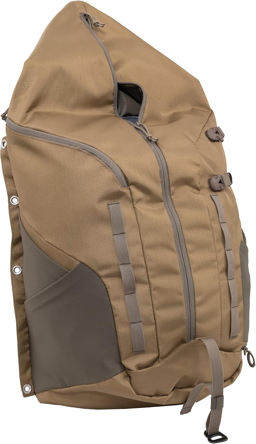 • Fully equipped with mesh back band, rain cover, side spotting scope pocket, double side pockets on each side of pack, two side compression straps with drop-down gun boot and waist belt that accommodates clip-style holster