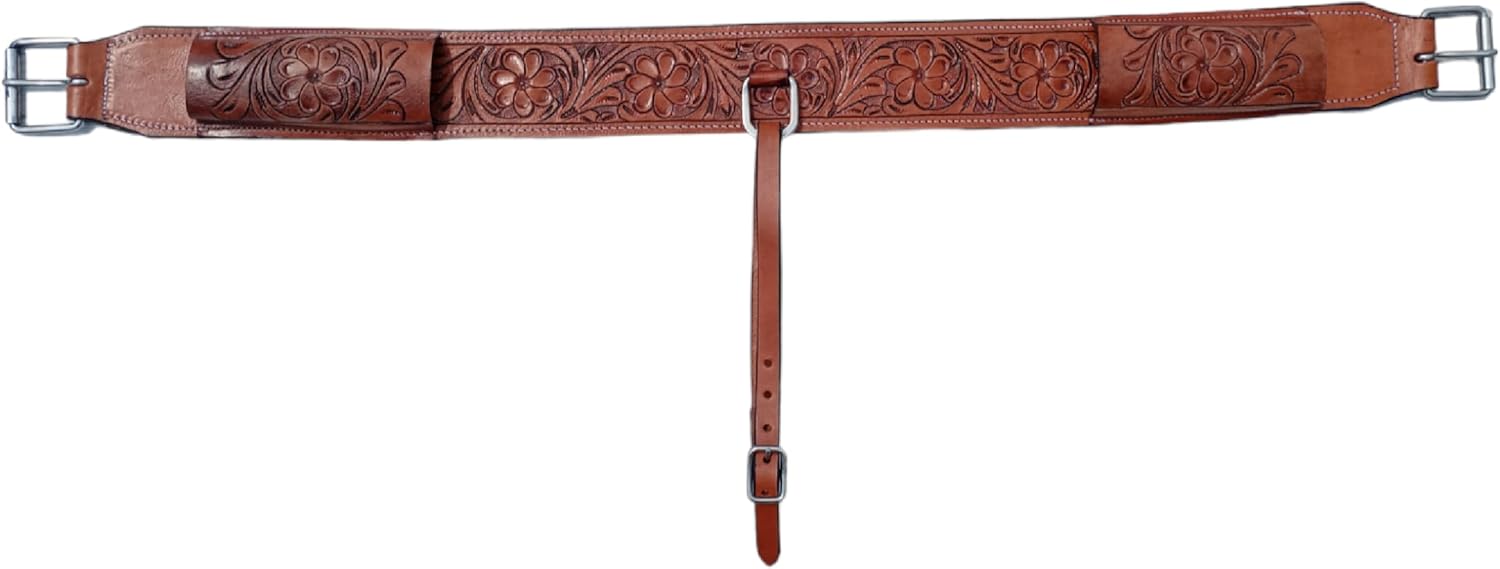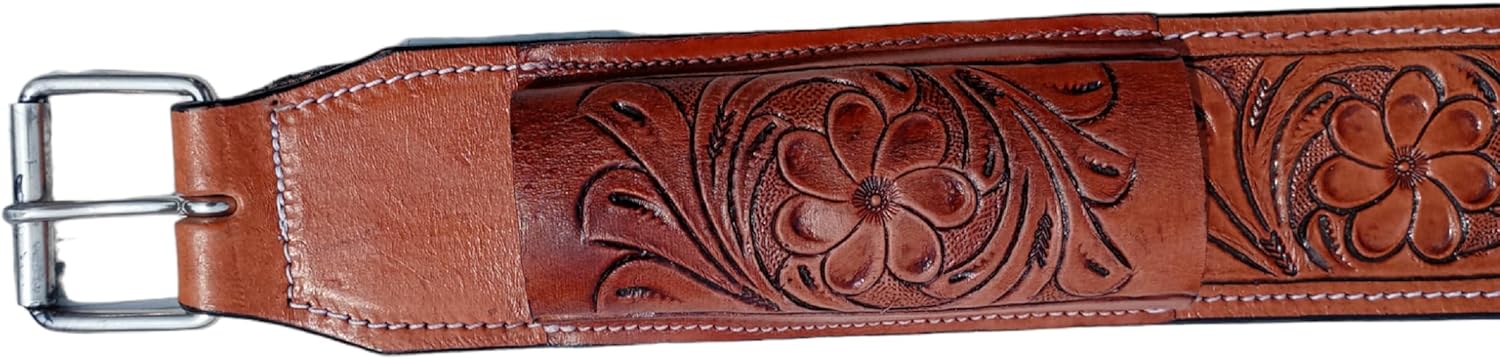 This leather back cinch is a perfect addition to your tack collection and will fit most western back cinch .Floral tooled leather will easily match any saddle to make your set complete. This back cinch features a leather sleeve to tuck your billet straps into to prevent any excess straps from hanging off of your horse. The rough out underside is soft and prevents pinching and chafing, even against sweat. Measurements: Color: Tan Length: 40" buckle to buckle Leather Width: 3" Buckle Width: 2" Connector Strap: 5 - 7''