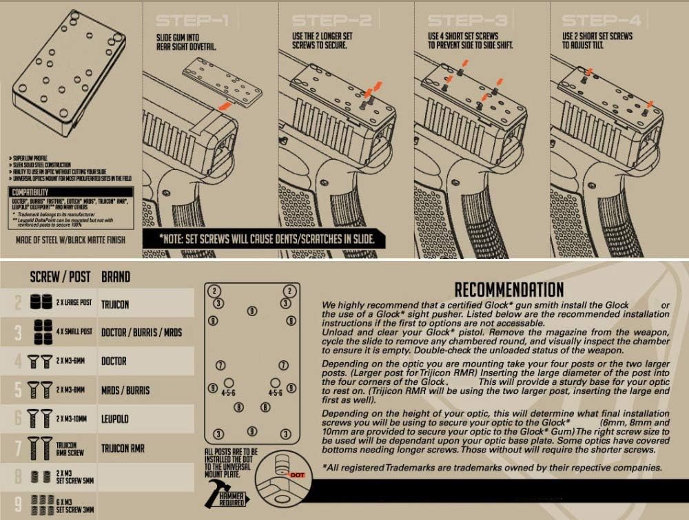 NOTE: Fits for all Models Except 42/43. The pins for the RMR red dot only fit for the original RMR. But it can also install well on the replica RMR only with the screws.