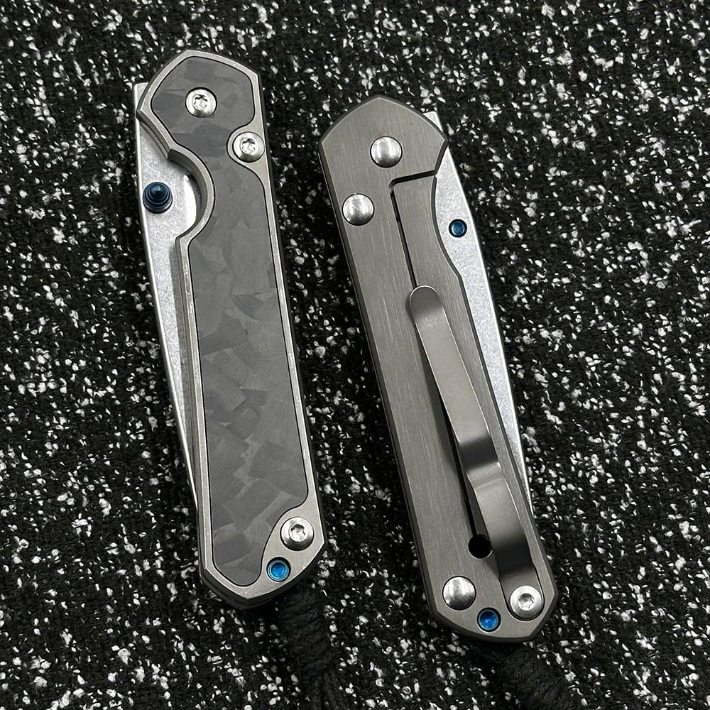 Small model Total length: 172mm Blade length: 70mm Handle length: 100mm Edge width: 21mm Edge thickness: 2.4mm Cutting edge: D2 Weight: 110G Hardness: 60HRC Surface: stone washing Handle: Steel+Carbon Fiber Sheet