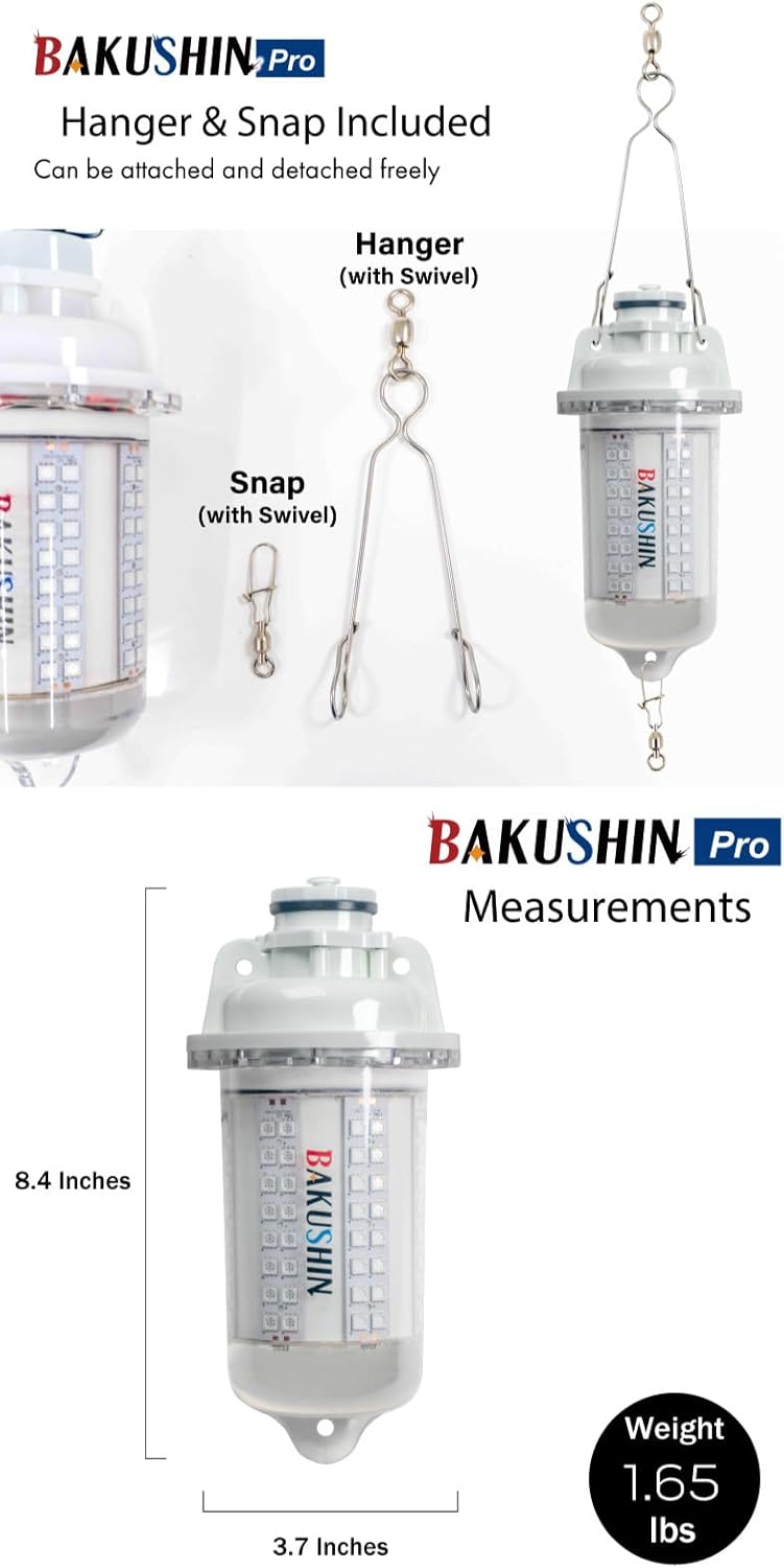 About Our Product: FUNKS BAKUSHIN Series BAKUSHIN Pro Fully Cordless Fish Attractor Light. Once fully charged, no power supply or wires required up to 6 hours. Super bright and works great in the Deep Sea. Up to 500 meters water resistance(Time limit of up to 15 minutes in that depth, not recommended for long term use in that depth). With BAKUSHIN Pro, you don't need for carrying around heavy batteries anymore. Provides plenty of Illumination. Works for both Pier fishing and deep sea fishing from boats. Rechargable battery. Once fully charged you can go fishing without any power supply. Recommended usage for Bakushin Pro: Method 1. Drop the Bakushin Pro with a sinker attached on its own line and fish with a separate rod.Method 2. Use the Bakushin together with the fishing rod like a normal squid fishing light. Brighten your night fishing experience with BAKUSHIN Pro!