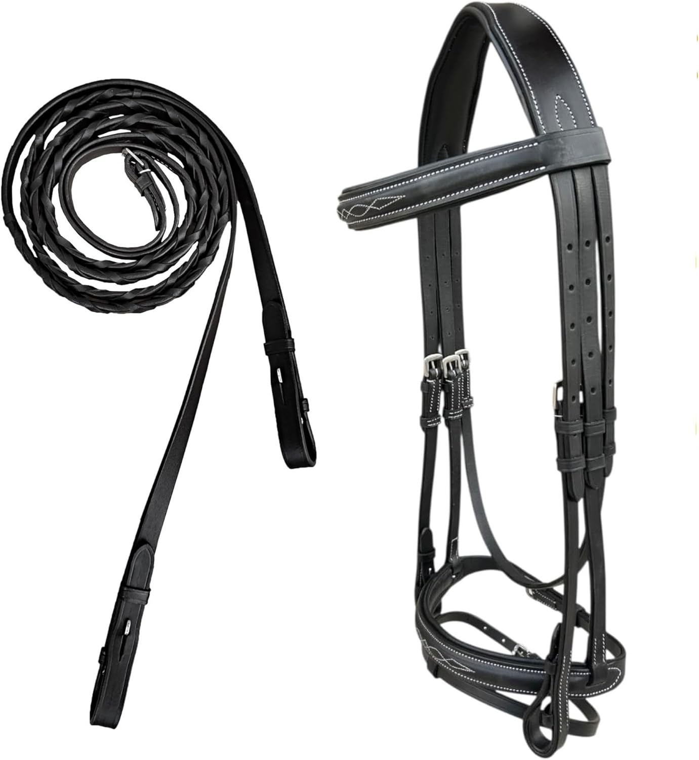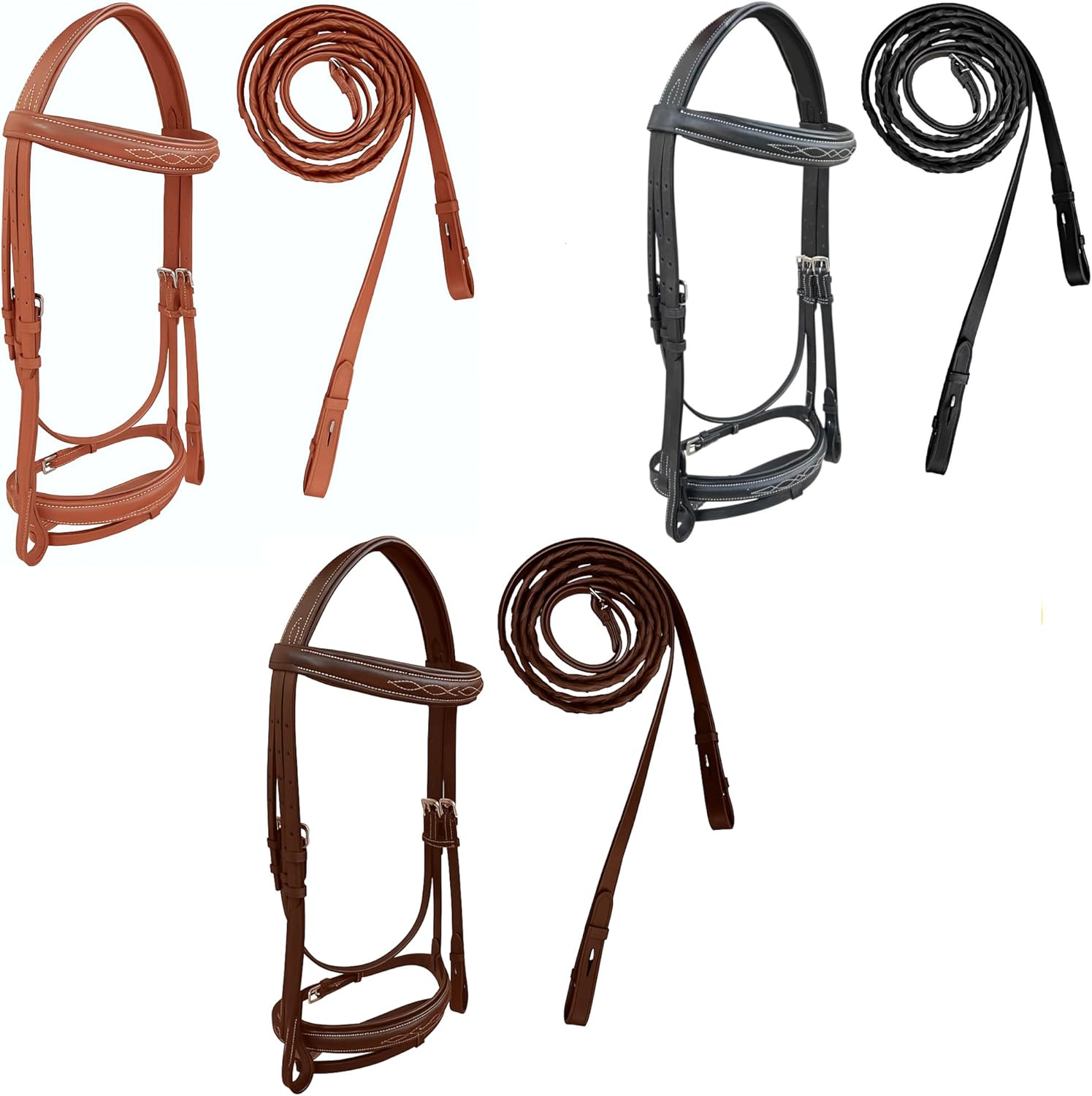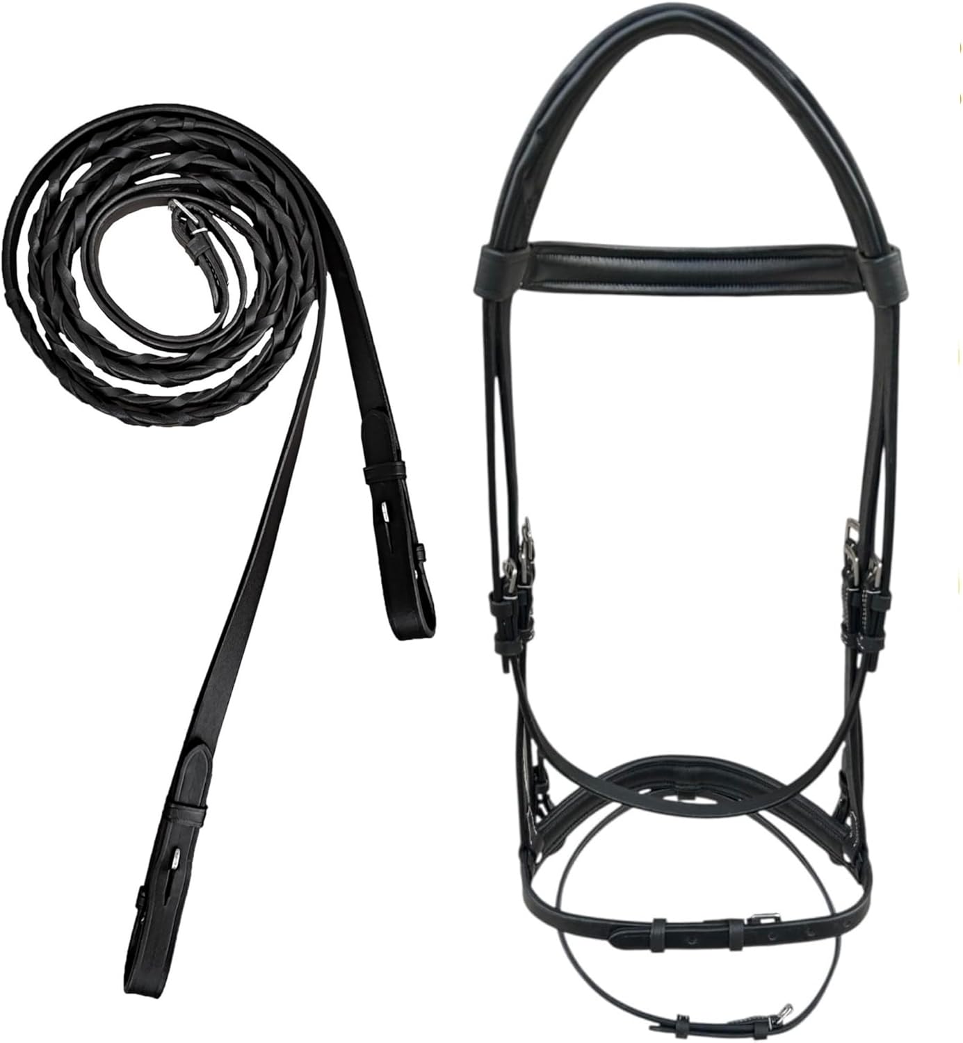 Elevate your equestrian experience with the Majestic Ally Fancy Stitched Padded Bridle. This full-size bridle showcases exquisite craftsmanship with its detailed fancy stitching and thoughtful padding for your horse's comfort. The comprehensive set includes essential components - the crown, browband, and noseband, complemented by laced reins for superior grip and control. The versatile design features a removable flash attachment, allowing you to customize the fit according to your riding needs. Perfect for both daily training sessions and competitive events, this bridle combines functionality with elegant styling. The carefully constructed design ensures proper fit and comfort for your horse while maintaining the classical appearance valued in equestrian sports. The black color offers timeless appeal and coordinates seamlessly with any riding outfit or horse coloring.