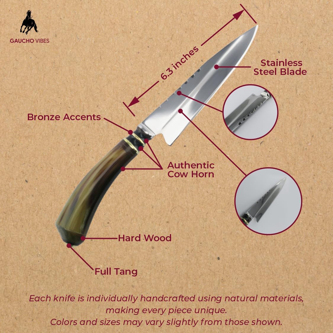Elevate your knife collection with this expertly handcrafted Argentine Gaucho knife. Forged from premium stainless steel, the blade offers exceptional sharpness and durability, perfect for both outdoor activities and everyday cutting tasks. This traditional Gaucho knife is designed with a striking handle that combines natural cow horn, hardwood, and polished bronze for a luxurious and ergonomic grip.