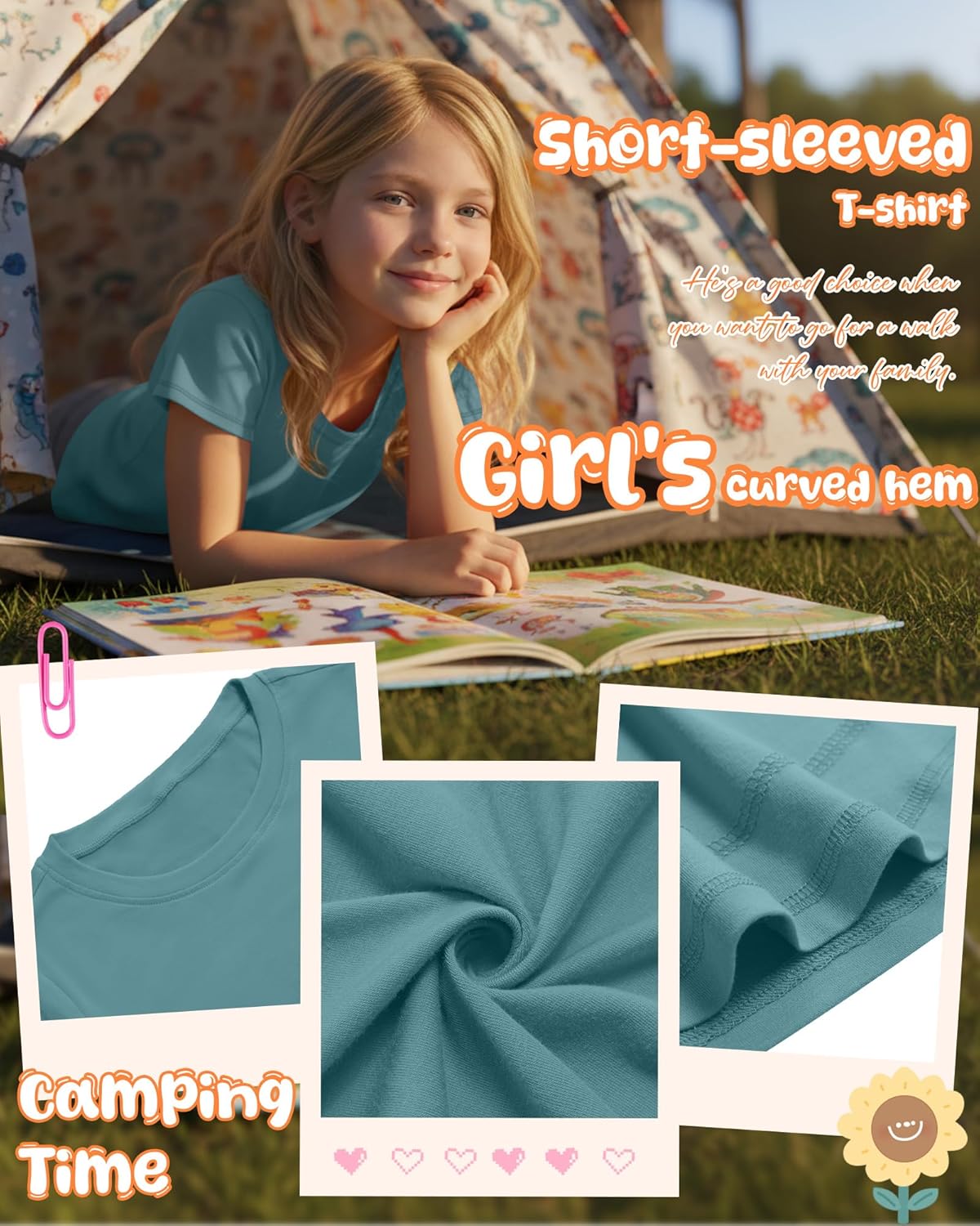 Features: Multiple colors available: Our girls' loose fit t shirts have a relaxed, flowy silhouette that suits all body types. The loose design allows air circulation, keeping kids cool in summer, and leaves space for running, jumping, or climbing without tightness. Practical design: Our kids knit crewneck tops feature meticulous craftsmanship: the contrast stitching is evenly applied, and the curve hem is neatly finished to avoid fraying. Specifications: Material: 60% Polyester, 35% Rayon, 5% Spandex Package includes: 4 x Girls' short sleeve shirts Notes: Manual measurement, please allow slight errors on size. The color may exist a slight difference due to different screen displays. Hand/machine wash in gentle with cold water, hang to dry or line dry