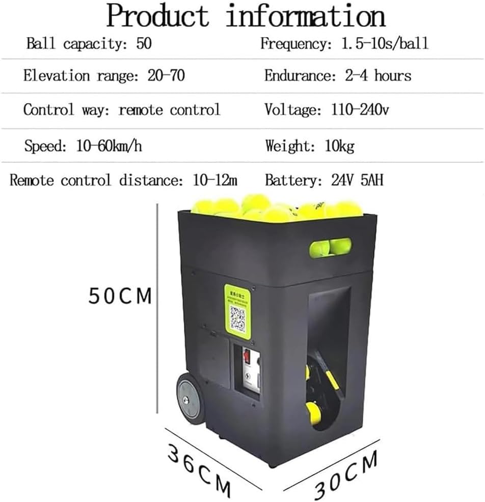 Portable Automatic Tennis Ball Launcher, Tennis Ball Machine, 50 Large Capacity, Adjustable Launching Angle, Speed, Rotation Frequency, for Beginners Solo Training SportsFeatures:The whole machine weighs only 10 kg and is equipped with a towing wheel and a pull rod.The battery compartment allows easy access to the lithium battery. It can also be loaded inside the machine.It is small in size and easy to carry. It is designed to be integrated into the machine and can be used immediately upon receipt without installation.Basic movement shaping training, advanced exercises for beginnersSpecification:Name:Tennis Ball Tosser MachineFrequency: 1.5 to 10 seconds/ballBattery life: 2 to 4 hoursControl mode: remote control/app.Speed: 10-60KM/HRemote control distance: 10-12MBattery properties: 24V5AHBall capacity: 50 pieces (not included)Weight: 10 kgProduct size: 50*36*30cmProduct includes:1*tennis ball machineNote:If you find any problems with our products, please feel free to contact us by email to resolve the issue.