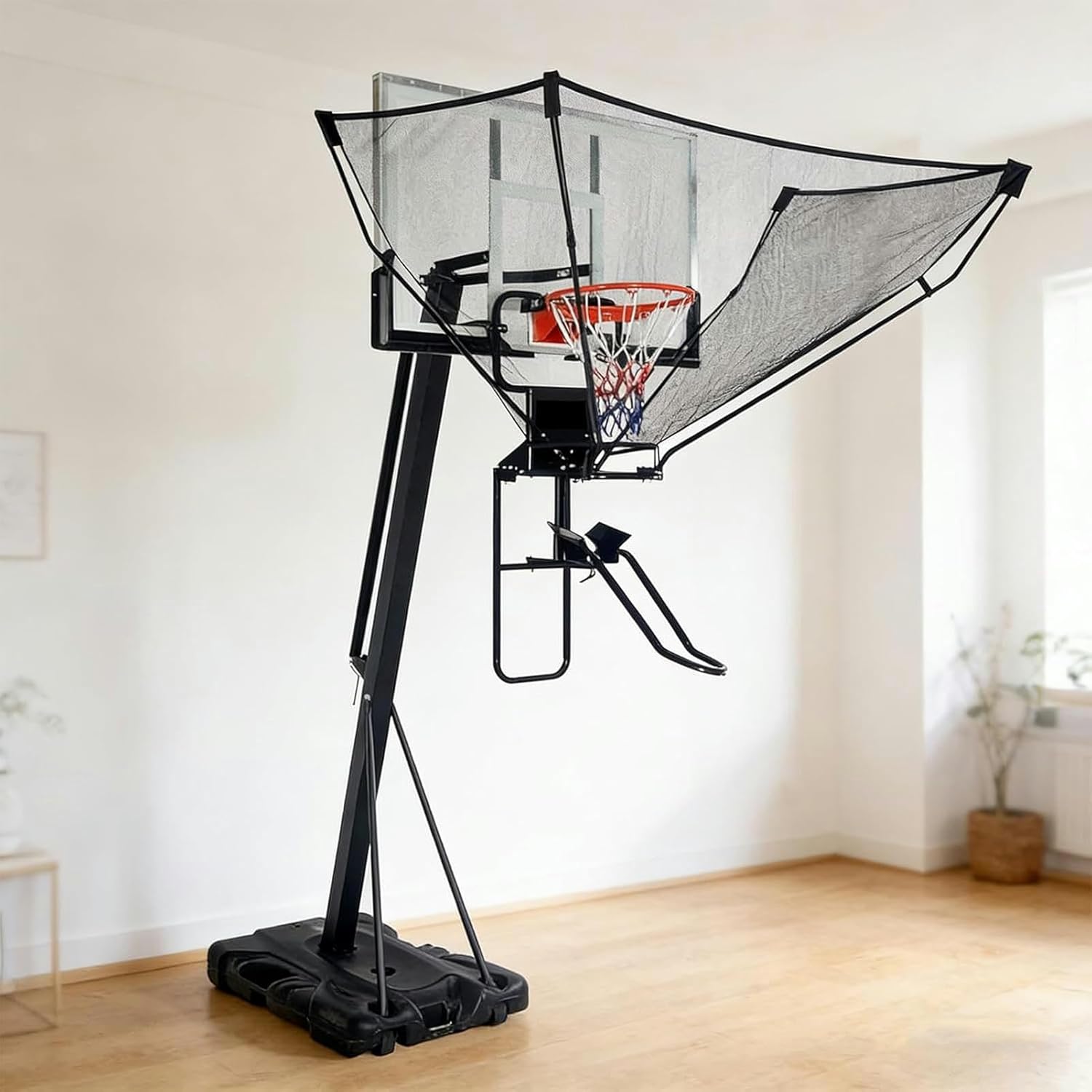 This basketball hoop return attachment is compact, easy to store, suitable for individual practice or team practice, allows players to achieve good training effect in a limited space, This basketball rebounder attachment is made of high quality steel frame and high density net, strong impact resistance, double reinforced padded clamps can help to securely fix the basketball equipment in the basketball frame, you can rest assured that it is a good choice for indoor and outdoor basketball court trainingProduct Name: Basketball Return System with Automatic Ball Return NetProduct weight: 11kg/24 poundsProduct color: BlackProduct material: Iron frame, polyester meshProduct features: Rebound 180 ° rotation multi angle shootingPackaging: 1 * Basketball Rebound Return Machine