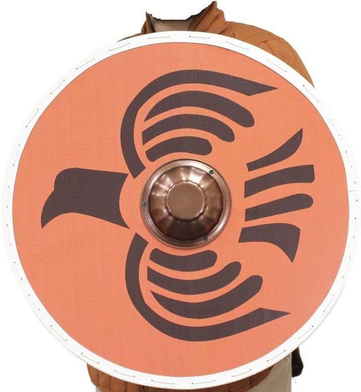 The Odin Raven Viking Raider Medieval Norse Cosplay Wooden Round Shield is a large Viking inspired round shield with a classic odin raven Hugin and Munin design. The Viking shield is made of a smooth composite wood which is considerably stronger than plywood. White leather line the border and a rustic metal disc boss has been bolted in the center. The Viking shield will hold up well against the rigors of moderate combat. The painted surface of the shield has also been applied with several coats of varnish to protect it from wear. On the Viking shields backside, dual leather straps are used to secure the arm. The wooden Viking shield measures about 24 inches in diameter more than enough to cover your arm up to the elbow. Whether for backyard brawling or for display purposes, this shield will suit your purposes wonderfully. MANUFACTURED & SOLD BY NAUTICALMART INC.
