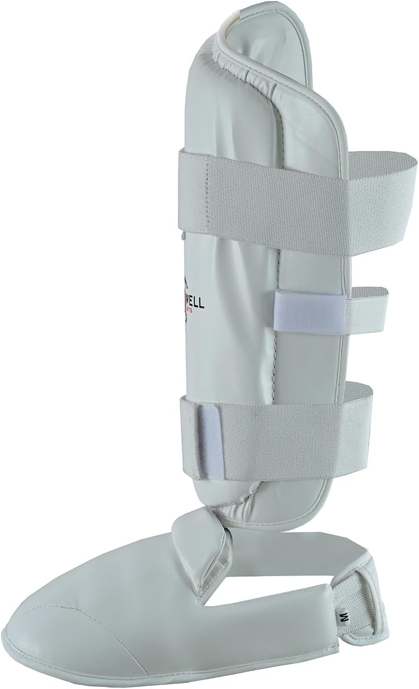WUKF Style White Karate Competition Shin Guards, Ergonomic shape designed with a natural curvature that moulds naturally for maximum comfort and security. Double stitching and reinforced elastic for added strength and quality Removable foot protector