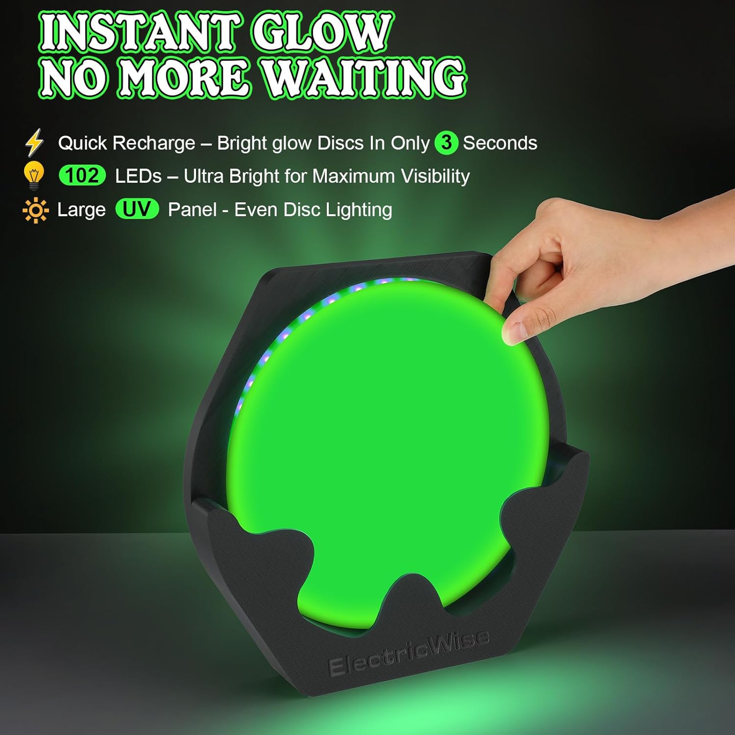 • Large Panel Full Coverage: the disc golf glow charger features a ring shaped UV LED panel with a wider coverage area; Compared to traditional flashlights, it delivers more even lighting and brings Glow Discs to maximum brightness in just 1 second, enhancing your night game experience; Please place the disc lightly when charging as the sensor reacts instantly and no pressure is required