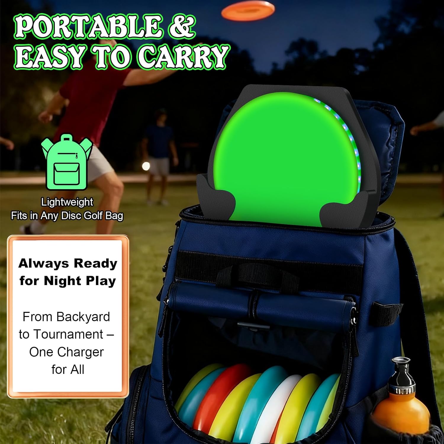 • Portable & Durable, Perfect for Any Outdoor Scene: Compact enough to fit in your disc golf bag, with a sturdy outer case and transparent protective panel. Built for long lasting use, ideal for backyard fun, camping, tournaments, night play, and outdoor practice