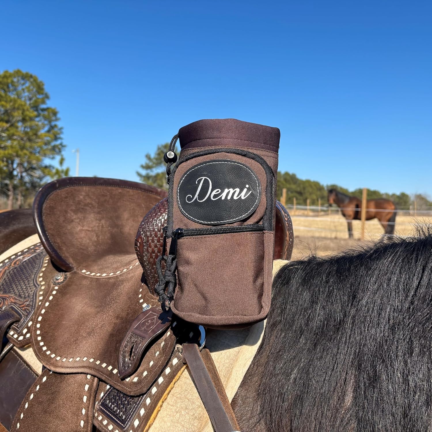✔️ Laser-engraved personalization ✔️ Perfect horse gift ✔️ Insulated for temperature control ✔️ Secure attachment to saddles ✔️ Holds up to 40oz bottle ✔️ Multi-pocket design ✔️ Doubles as phone holder ✔️ Easy access while riding ✔️ Durable 1680-denier nylon ✔️ Tested by equestrians