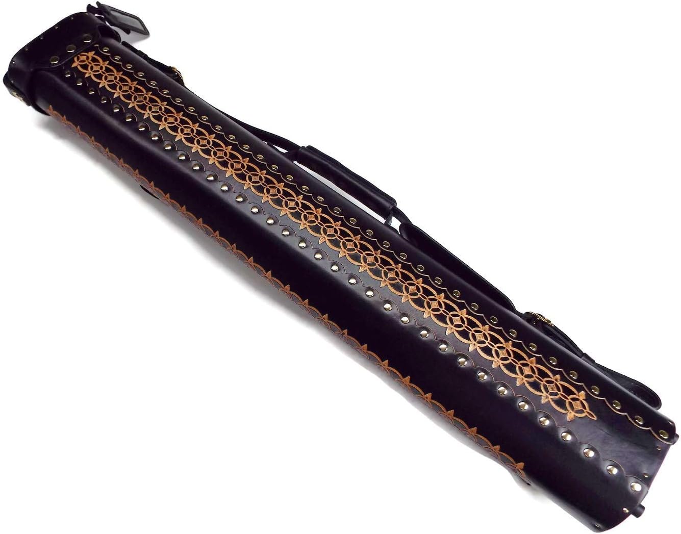 Interior has lined tubes that can hold butts and shafts in either direction. Black leather with gold colored hardware. Two generous sized pockets for your cue accessories and third jump pocket. Top and side handles. Shoulder strap