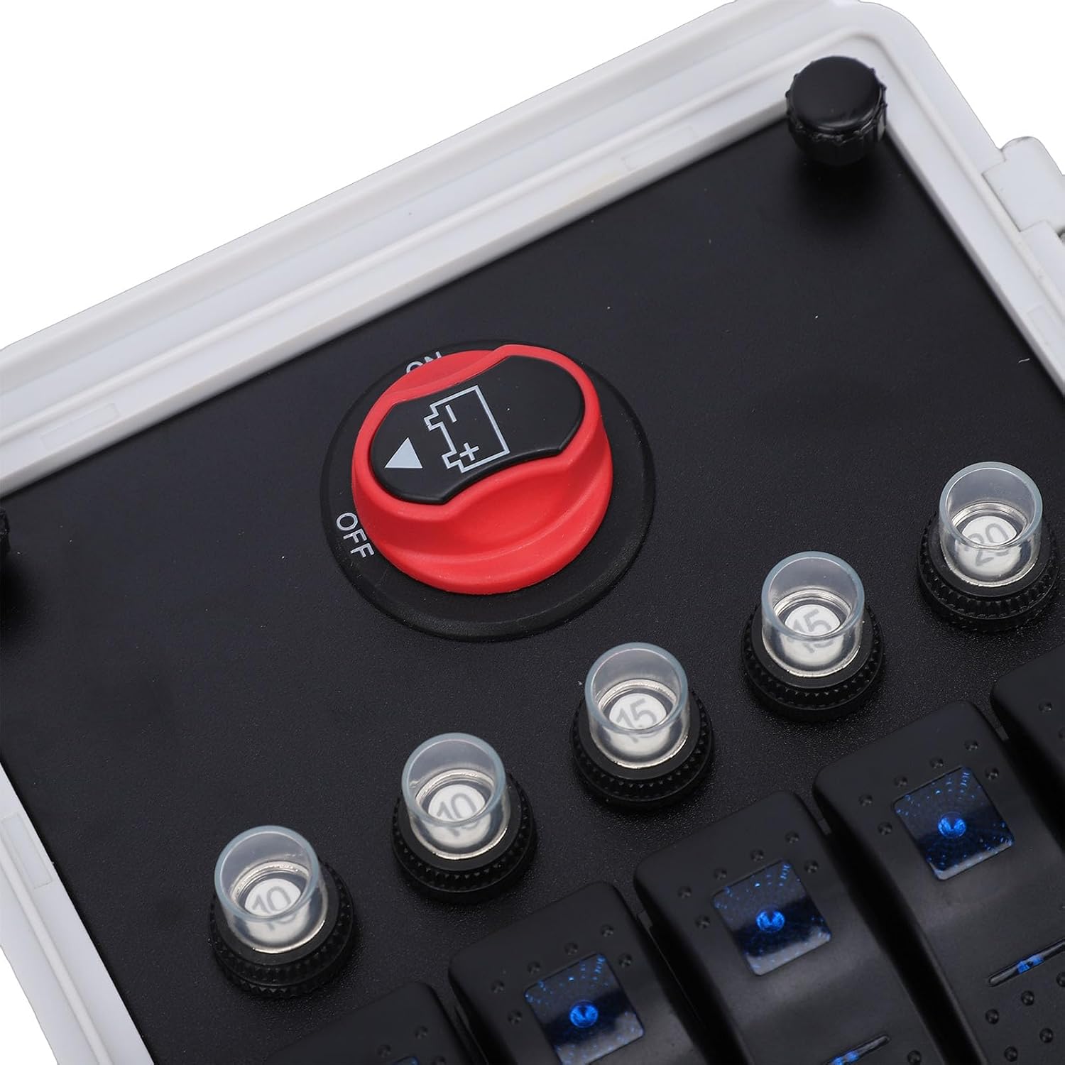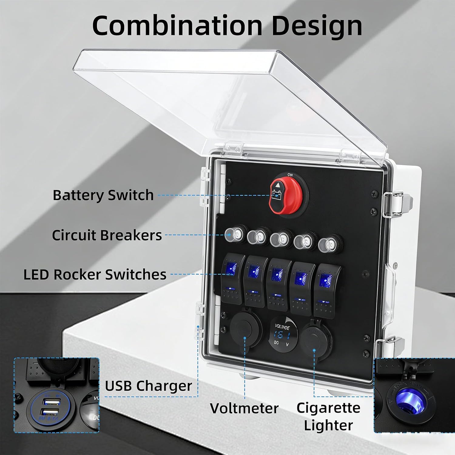 [Quick & Easy Installation] Designed for hassle-free setup, the pre-wired internal circuits and clearly labeled terminals simplify the installation process. mounting hardware is included, allowing you to secure this switch panel in trucks, rvs, atvs, or boats quickly without complex wiring modifications. [Versatile Power Control & Charging] Featuring 5 rocker switches, a fast-charging usb pd port, and a 12v lighter socket, this panel allows you to simultaneously control and charge multiple devices. perfect for automotive, marine, and outdoor use, it lights, air pumps, inverters, and other equipment with ease. [Ip67 & Durable Construction] This rugged electrical switch box is built with an ip67 rating and >-retardant abs pc plastic housing, ensuring superior resistance to rain, snow, salt, and harsh outdoor conditions. the sealed design prevents intrusion, making it ideal for marine and applications where durability is a must. [Secure Wiring & Outdoor Protection] The robust aluminum panel and reinforced abs pc plastic casing the switch panel and power sockets from damage. integrated cable sheaths and dual cable connectors ensure secure wiring management, preventing loose connections and protecting against dampness in outdoor environments. [Enhanced Visibility & Battery Monitoring] Equipped with illuminated rocker switches and luminous labels, this panel ensures clear status indication even in low-light conditions. the built-in led voltmeter provides real-time battery voltage monitoring, helping you track power levels and prevent unexpected power loss. Spec: Item Type: Rocker Switch Box Material: ABS, PC Plastic, Aluminum Panel Current: 20A Electrical Box Size: Approx. 230 x 170 x 112mm / 9.1 x 6.7 x 4.4in Package List: 1 x Electrical Box 8 x Screws 2 x Connectors 4 x Accessories 2 x Stickers How To Use: Match the appropriate voltage and current