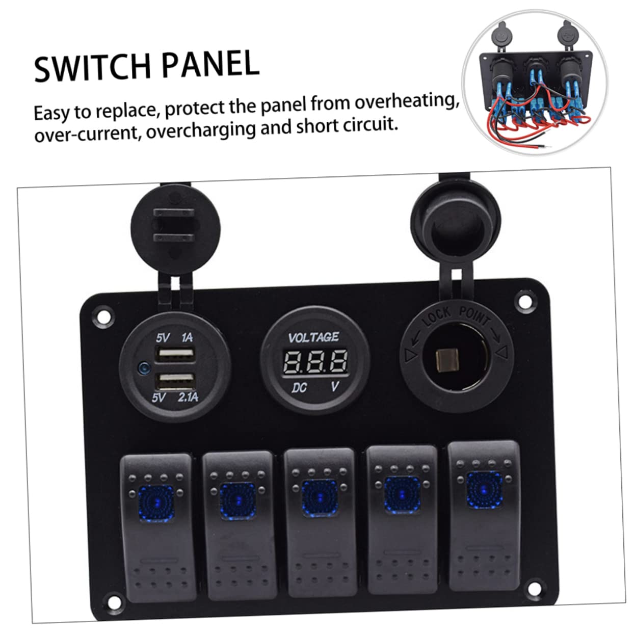 Package Include 1 x panel Features - Input voltage: DC 12V/20A, 24V/10A circuit breaker. - Size: About 15.00X10.50X8.00cm/5.89X4.13X3.14inch combination panel. - Material: Aluminum alloy, ABS, LED, copper boat panel. - Color: Black modification circuit breaker panel. - LED color: Blue color control plate. - USB: 5V 1A +2.1A ship panel. - Working temperature: -20°C~+110°C modification plate. - Cigarette socket: 12V/ 24V waterproof panel. - Suitable for many kinds of vehicles, boats, motorcycles, , boats, ships, trailers and so on panel. - The digital voltage display helps to monitor the electrical safety of vehicles rocker panel. - Adopted by high grade material, sturdy and durable for use modification circuit panel. - Easy to replace, protect the panel from overheating, over- , overcharging and short circuit combination. - The voltmeter with LED light, you can check the digital of panel at night control panel.Goods Informationwaterproof panel This item is practical panel, which is made of , which is with 5 combination , USB ports, cigarette lighter socket, voltage display, LED light.combination Easy to install, fit all kinds of vehicles, boats, motorcycles, , boats, ships, trailers and so on