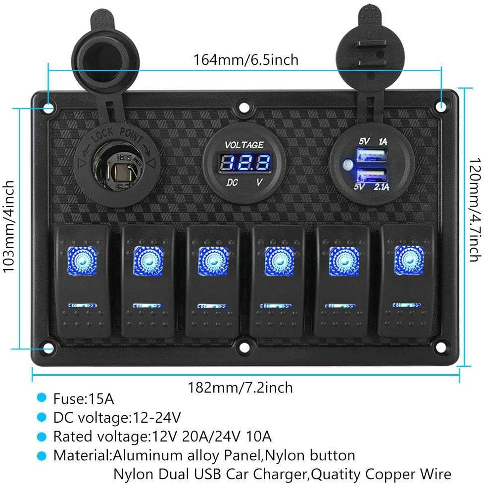 Specification:Rocker Switch: 6 Voltage: DC 12V 20A / 24V 10A.Maximum Output Power: 240WElectric Power: AC 1500 V Operating Temperature: -25 °C to 80 °CTwo USB Ports: 5V 3.1A (1A 2.1A)Voltmeter Measurement: 6-28 V.Cigarette Lighter Output Voltage: 12-24VMaterial: ABSLight Colour: Blue / GreenPackage Lists:1 * 6 Gang Switch Panel