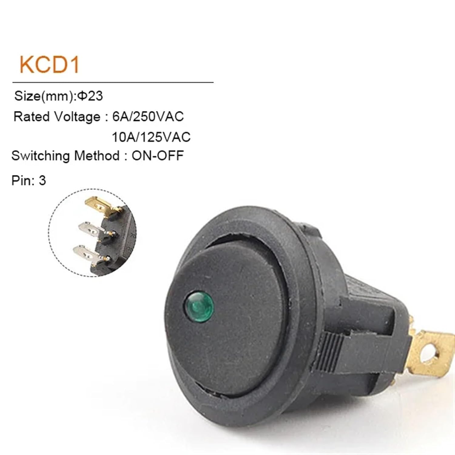 SwitchesProduct Description:5/10 PCS ON/OFF 250V/10A 125V Round Rocker Dot Boat Switch Waterproof LED Light 23mm Power Toggle Switches Boat Car Rocker SwitchSize:23mmMounting Hole:21.5mmRated voltage: 6A 250V AC/10A 125VSwitching Method: ON-OFFPin:3Pin 2 Position