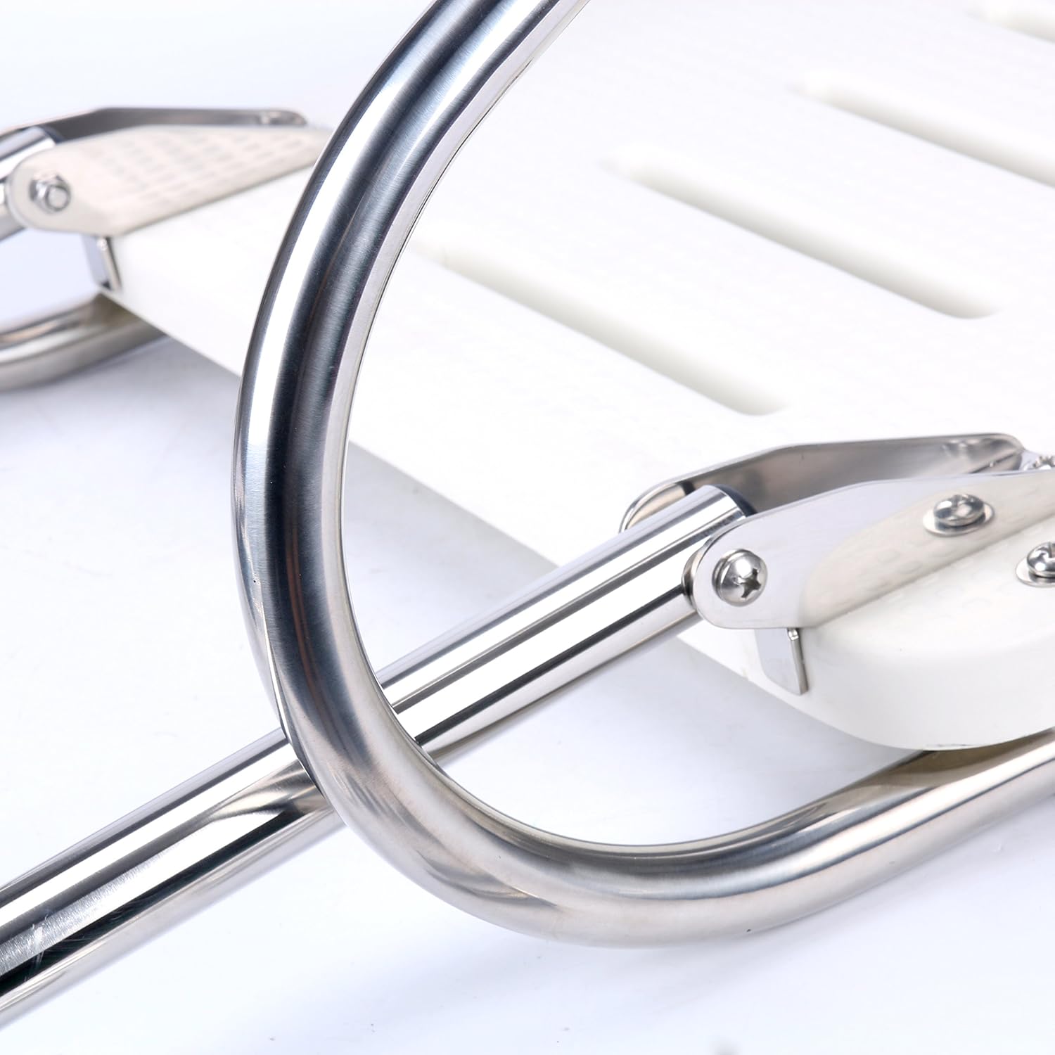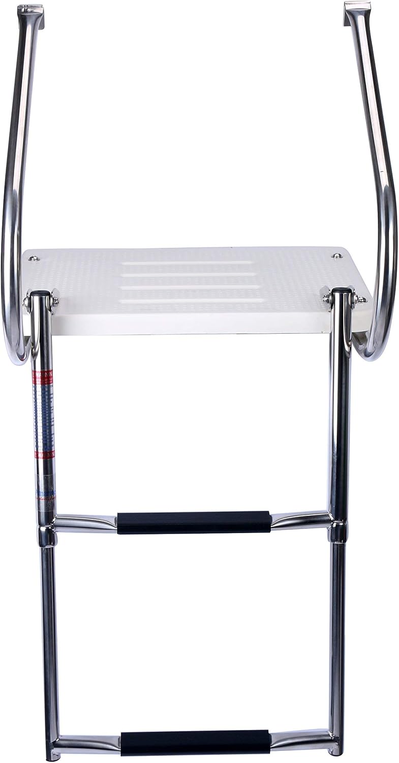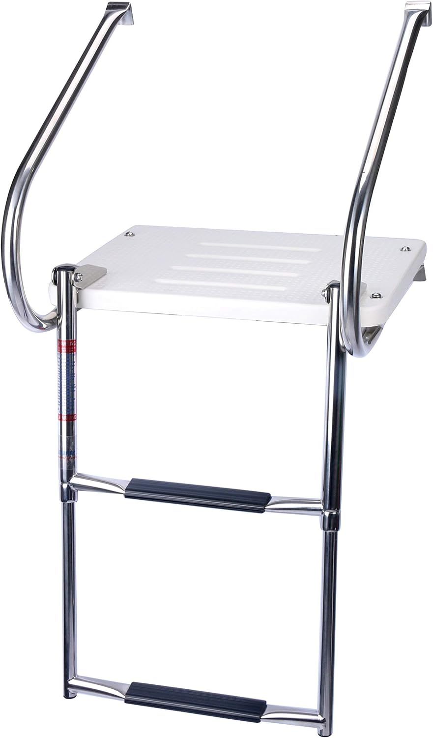 Product Features Get the most out of your boat by increasing the usable space and facilitating easy entry and exit High Density ABS and stainless steel construction designed to withstand harsh marine conditions Outboard and inboard models available with either single step telescoping two or three step ladder Supplied with all mounting hardware, brackets. Can be mounted on either side of your motor depending on best fit Product Description Help make your boat more user friendly and functional. Keep you fishing boat but give you or the kids the ability to take a dip without the struggle of getting back into the boat. A good swim platform makes a world of difference and should be the first addition to any boat without one. Made out of marine grade ABS and stainless steel hardware,This swim platforms are constructed with top of the line marine stuff. Available as either outboard (single rail) or inboard models (double rails) we have a style available to fit most any transom. Our boat platforms come with all mounting hardware and brackets needed . Inboard Swim Platform with Telescoping Two-Step Fold Down Ladder Maintenance free. High strength polyethylene will not bleach, fade or crack. 7/8" diameter tubing is polished stainless steel. All stainless steel hardware included. Platform is 3/4"T x 18"W x 14"L. This product is brand new and it includes the ladder. Best possible deal! Transom Height Required: 24" Color: White Easy Clean
