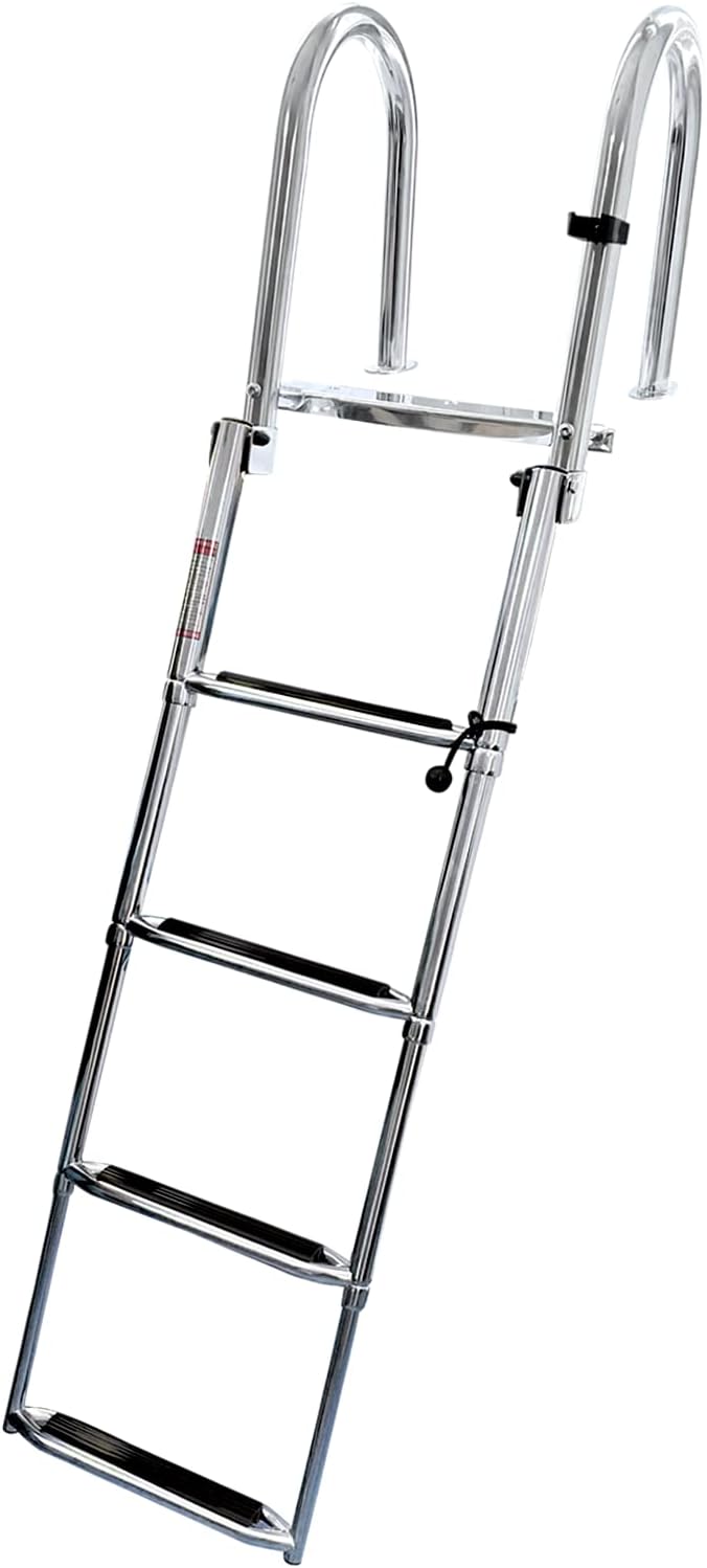 ISURE MARINRE 4 Steps Pontoon Boat Ladder Folding Telescoping Rear Entry Inboard Stainless Steel Swim Deck LadderSpecification :Condition : 100% Brand NewItem Type : Boat Folding Ladder Color : Sliver.Material : 316 Stainless Steel Mounting Holes: 7Hole Diameter: 1/4"Handle Height: 17"Comfortable 2" Wide steps.Overall Ladder Width: 16.25"Distance to first step: 10.5"Distance Between Steps: 10"Ladder Length (extended): 41.375"Ladder is constructed of 1.5" diameter thick,316 stainless steel tubing.Feature:Telescopic length 445mm (min) to 1066mm (max)600-lb. Max weight capacity.This telescopic boat ladder is made to be bolted to a horizontal platform such a the boat floor or side railings depending on the installation.The design of this platform ladder makes it possible to be used as on a pontoon boat.Some of customers have also used this as a low profile dock ladder.Installation Step 1Use M8*40 self-tapping screw to fixl-shaped plate to your platform.Installation Step 2Fix handrail to L-shaped plate with M8*50 bolts, and then fix the front end of handrail to the platform with M8*40 self-tapping screw.Installation Step 3Finally use nuts and M8*60 bolts and nylon spacer to fix the steps to handrail. And cover PP caps onto both the head of nuts & hexagon bolts.After the installation is successful, please slowly lower the ladder.Wide Application :This telescopic boat ladder is made to be bolted to a horizontal platform such a the boat floor or side railings depending on the installation.The design of this platform ladder makes it possible to be used as on a pontoon boat.Some of customers have also used this as a low profile dock ladder.Package Includes:1* Boat Folding Ladder