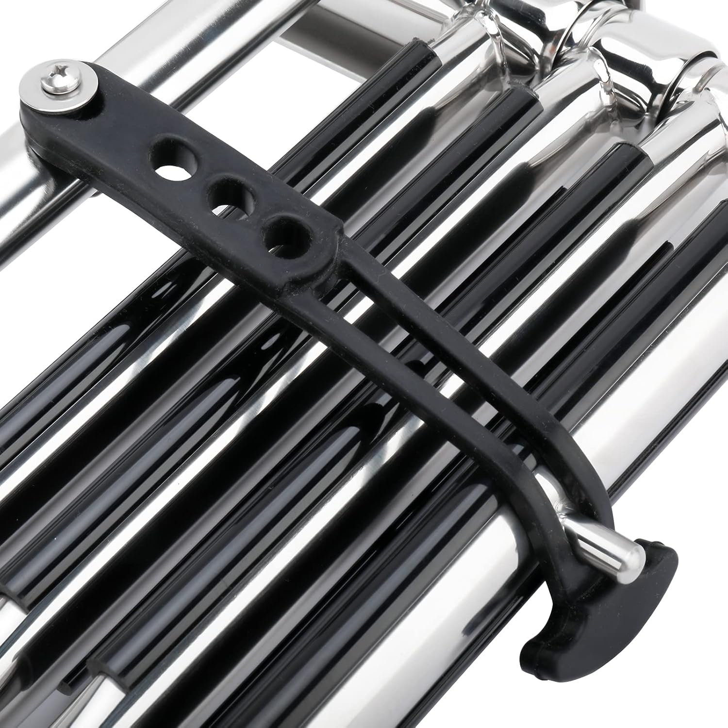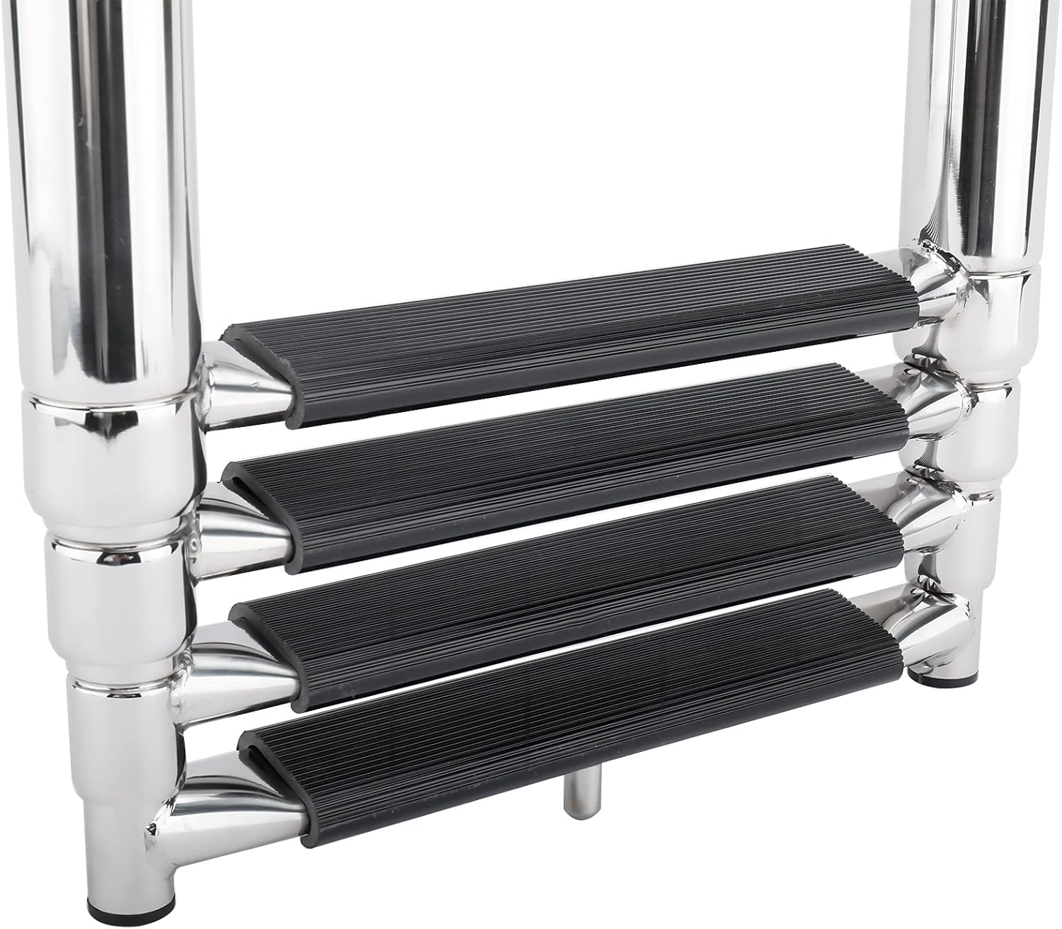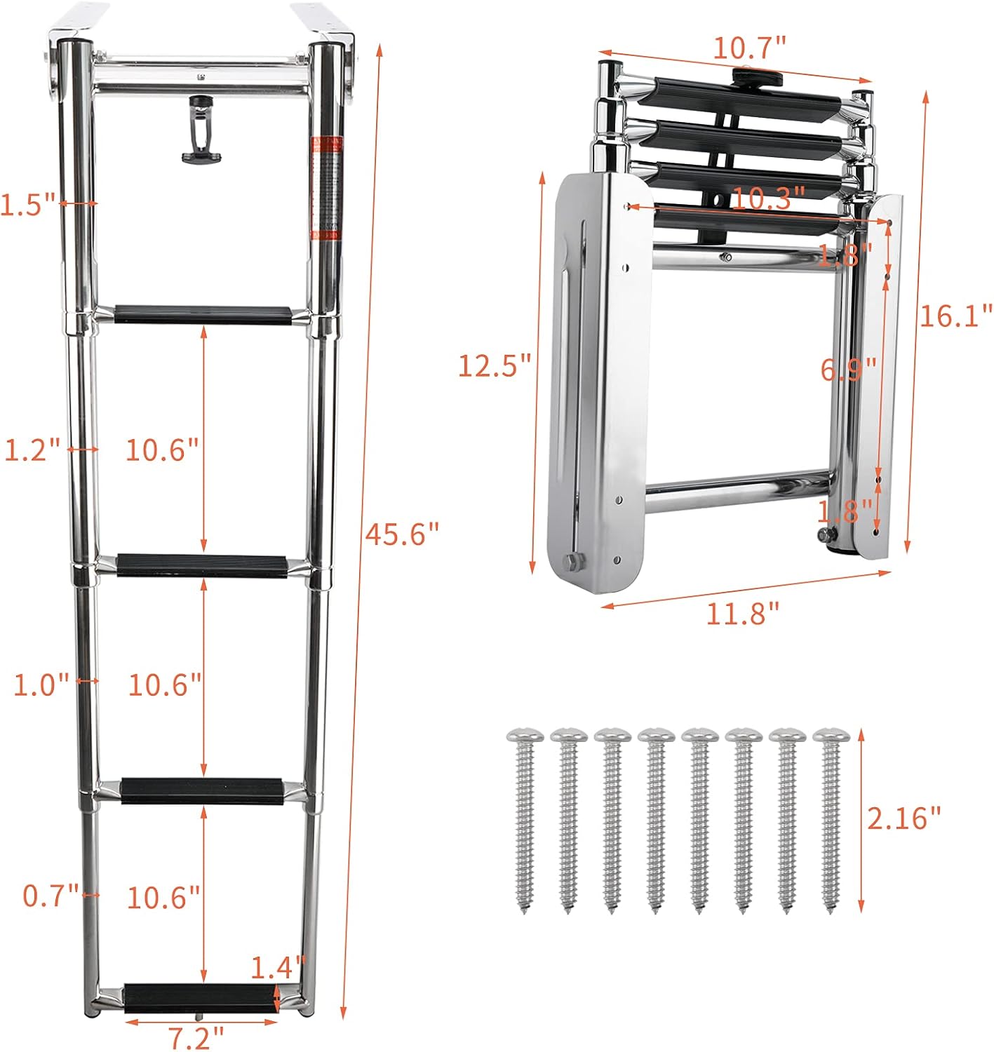 The ladder is to be installed under pontoon deck in the front,good quality stainless steel and the slide/folding mechanism works well.Very well-built, the spring that holds the ladder in the stowed position has plenty of tension to keep the ladder retracted when the boat is running in rough water. And because it has 4 steps it hangs deep into the water. When you are in shallow water simply use a bungee to hold the 4th step up to the 3rd step to prevent it from rubbing the ground.Features: Designed for under platform use - stows easily and compactly . Ideal for installations under swim platforms or under the deck on bow or side of pontoon boats . Ladder stows compactly within its own length . Spring loaded self-locking for stowage . No More dealing with Velcro Straps, Bungee Cords, and Rubber Straps. Carry handle for easy fold and unfold . Flat poly treads for increased comfort . 316 stainless steel - rated to 1190 lbs. How To Mount 1. Choose the most suitable side of your transom platform for mounting the ladder. 2. When mounting, locate a place where the ladder will not interfere with the turning of the motor or be near the propeller of your craft. 3. Position the mounting bracket with the ladder in the area to be attached. 4.Mark the bracket’s eight mounting holes onto the deck surface. 5.Drill the eight marked holes with a suitable drill bit. NOTE: It is recommended to through-bolt this ladder for a secure installation. 6. Mount the ladder in place by holding bracket up to platform and inserting mounting screws. Secure ladder in place with fasteners (not provided, as installations vary). Safety Guildlines No jumping or diving! Do not use when motor is running This ladder designed for boat use only Face ladder when entering boat or water Only one person on ladder at a time Check all steps and hardware before using