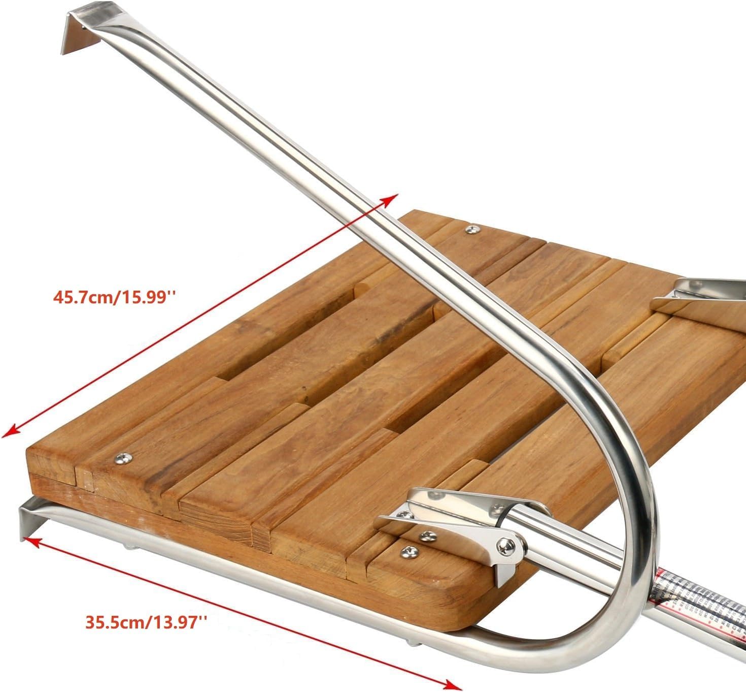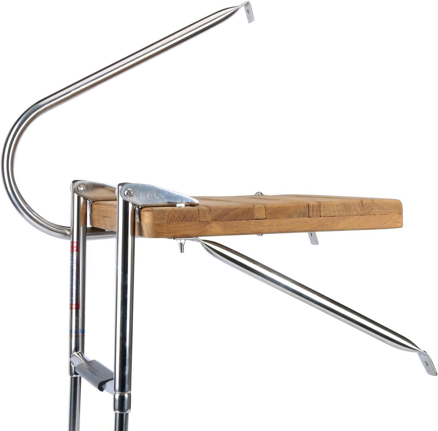 Product Features Get the most out of your boat by increasing the usable space and facilitating easy entry and exit Marine Grade Teak and stainless steel construction designed to withstand harsh marine conditions Outboard and inboard models available with either single step telescoping two or three step ladder Supplied with all mounting hardware, brackets. Can be mounted on either side of your motor depending on best fit Product Description Help make your boat more user friendly and functional. Keep you fishing boat but give you or the kids the ability to take a dip without the struggle of getting back into the boat. A good swim platform makes a world of difference and should be the first addition to any boat without one. Made out of marine grade Teak and stainless steel hardware,This swim platforms are constructed with top of the line marine stuff. Available as either outboard (single rail) or inboard models (double rails) we have a style available to fit most any transom. Our boat platforms come with all mounting hardware and brackets needed . Inboard Swim Platform with Telescoping Two-Step Fold Down Ladder 7/8" diameter tubing is polished stainless steel. All stainless steel hardware included. Platform is 3/4"T x 18"W x 14"L. This product is brand new and it includes the ladder. Best possible deal! Transom Height Required: 24"