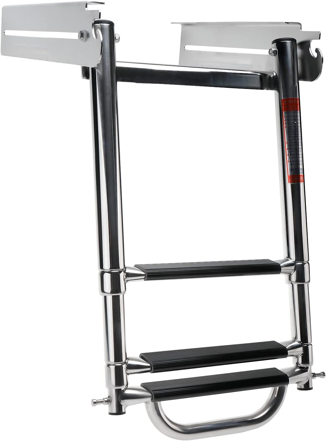 Features: Very well-built, the spring that holds the ladder in the stowed position has plenty of tension to keep the ladder retracted when the boat is running in rough water. And because it has 4 steps it hangs deep into the water. When you are in shallow water simply use a bungee to hold the 3rd step up to the 2nd step to prevent it from rubbing the ground. Designed for under platform use - stows easily and compactly . Ideal for installations under swim platforms or under the deck on bow or side of pontoon boats . Ladder stows compactly within its own length . Spring loaded self-locking for stowage . No More dealing with Velcro Straps, Bungee Cords, and Rubber Straps. Carry handle for easy fold and unfold . Flat poly treads for increased comfort . 316 stainless steel - rated to 1190 lbs. How To Mount 1. Choose the most suitable side of your transom platform for mounting the ladder. 2. When mounting, locate a place where the ladder will not interfere with the turning of the motor or be near the propeller of your craft. 3. Position the mounting bracket with the ladder in the area to be attached. 4.Mark the bracket’s eight mounting holes onto the deck surface. 5.Drill the eight marked holes with a suitable drill bit. NOTE: It is recommended to through-bolt this ladder for a secure installation. 6. Mount the ladder in place by holding bracket up to platform and inserting mounting screws. Secure ladder in place with fasteners (not provided, as installations vary). Safety Guildlines No jumping or diving! Do not use when motor is running This ladder designed for boat use only Face ladder when entering boat or water Only one person on ladder at a time Check all steps and hardware before using Never operate your boat with the ladder in “down” position. Serious injury, or damage to your boat or ladder may result.