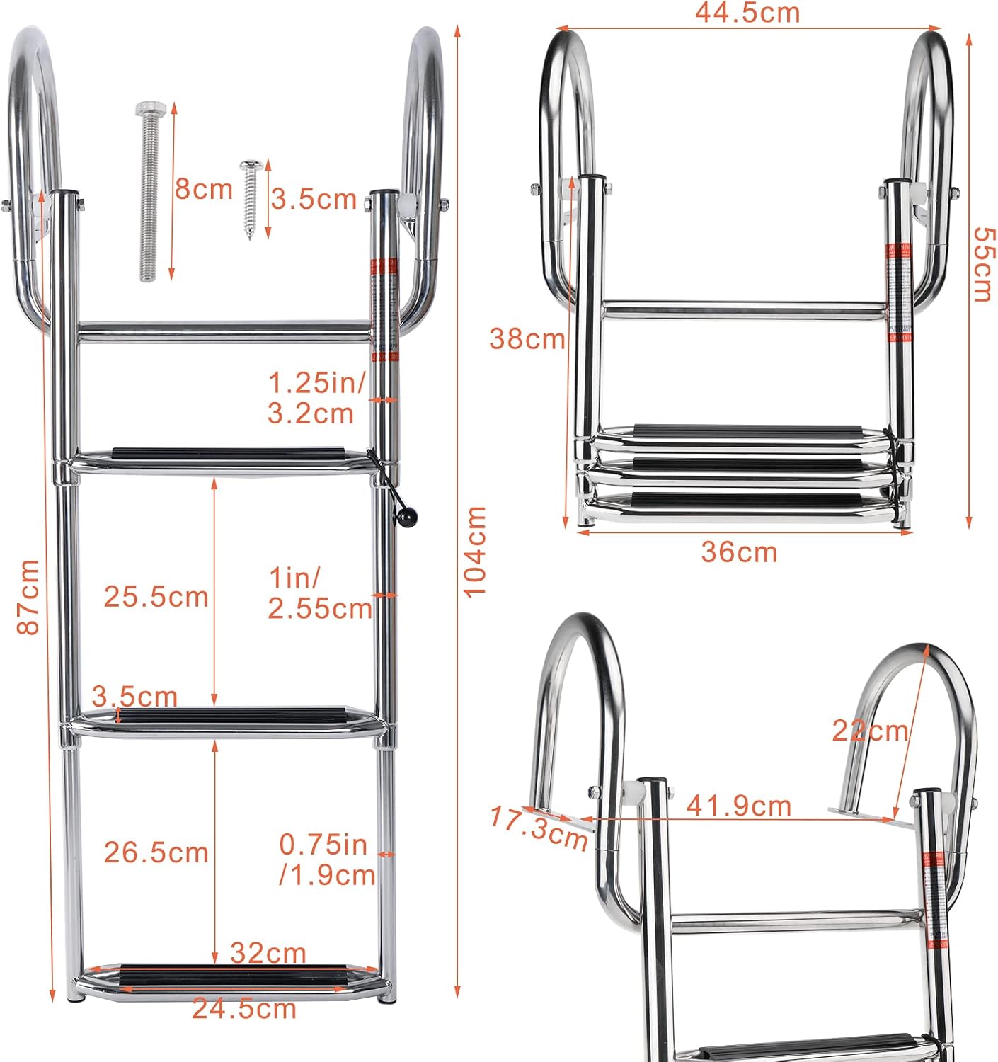• Boat Ladder's step has a slip-proof plastic tread to assure maximum safety.3 Step Pontoon Boat Ladder Unique universal self supporting design requires no tube support/stand offs