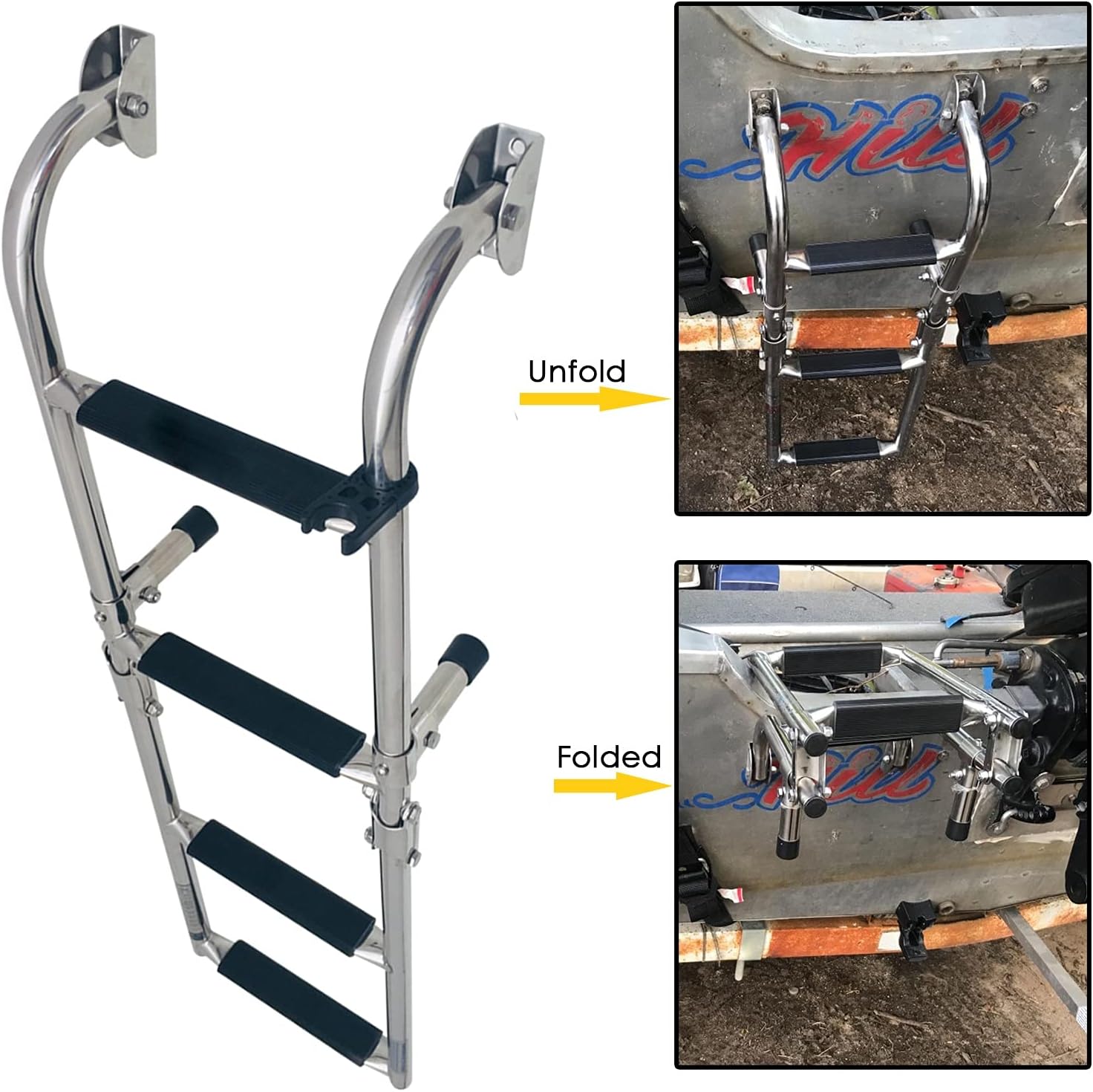 Heavy-duty stainless steel construction means your ladder will have a long service life free of dents, cracks, or corrosion and a powerful 440 lb. weight capacity. Considerate design, superior quality, and our good name make sure you'll enjoy this handy boat ladder for years to come.Specifications: - Material: Stainless Steel - Size: Expanded Height: 33.5" (85cm), Folded Height: 17.7" (45cm), Wide: 9.3" (23.5cm).- Load: 200 kg/440 lbsFeatures: - Made of durable 304 stainless steel.- Comfortable handrails for easy boarding.- Safety extra wide comfort non-slip steps.- Steps telescope ladder easy to close.- Flips up for easy storage.- Max weight capacity: 440 lbs.- Easily mounts to boat deck pool dock, bow or side etc.How To Mount: 1. Choose the most suitable side of your transom platform for mounting the ladder.2. When mounting, locate a place where the ladder will not interfere with the turning of the motor or be near the propeller of your craft.3. Mount the ladder in place by holding bracket up to platform and inserting mounting screws. Safety Guildlines: - Not jumping or diving!- Do not use when motor is running!- Only one person on ladder at a time!- Check all steps and hardware before using!