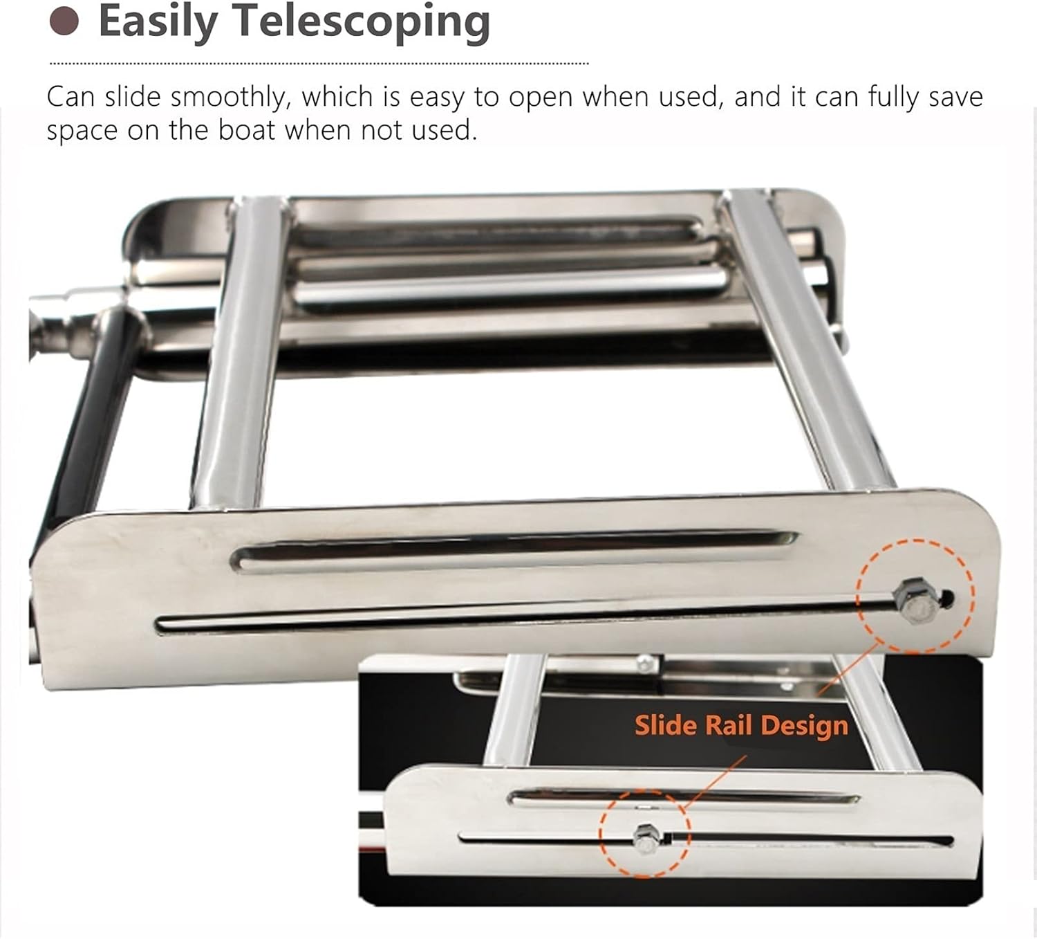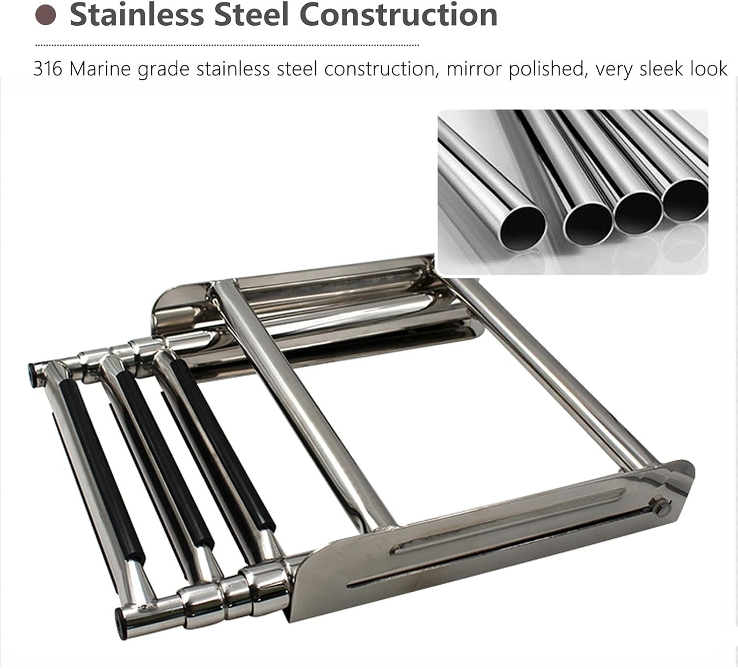 -- This boat ladder is made to be bolted to a horizontal platform such a the boat floor. for pontoon boat , fishing boat, dock, swimming pool, inflatable boat, Deck, Marine, Yacht Boat Ship, Diver -- Product Parameters: Product Name: Telescopic Boat Ladder. Material: 316 Stainless steel Surface : Mirror polished Black Step Length : 23cm/9in -- Package Includes : Telescoping Ladder with Mounting Screws -- Product Characteristic: 1. The sliding under-platform bracket to strength the stability of ladder 2. Each step has a slip-proof plastic tread to assure maximum safety 3. Installation is very easym 4. Steps drop smoothly into water and also quickly stowed away while not in use 5. Constructed of marine grade stainless steel for durability Note: Please allow 0.5-1 inch difference due to manual measurement.(1 inch=2.54cm) The color of the actual items may slightly different from the listing images due to different