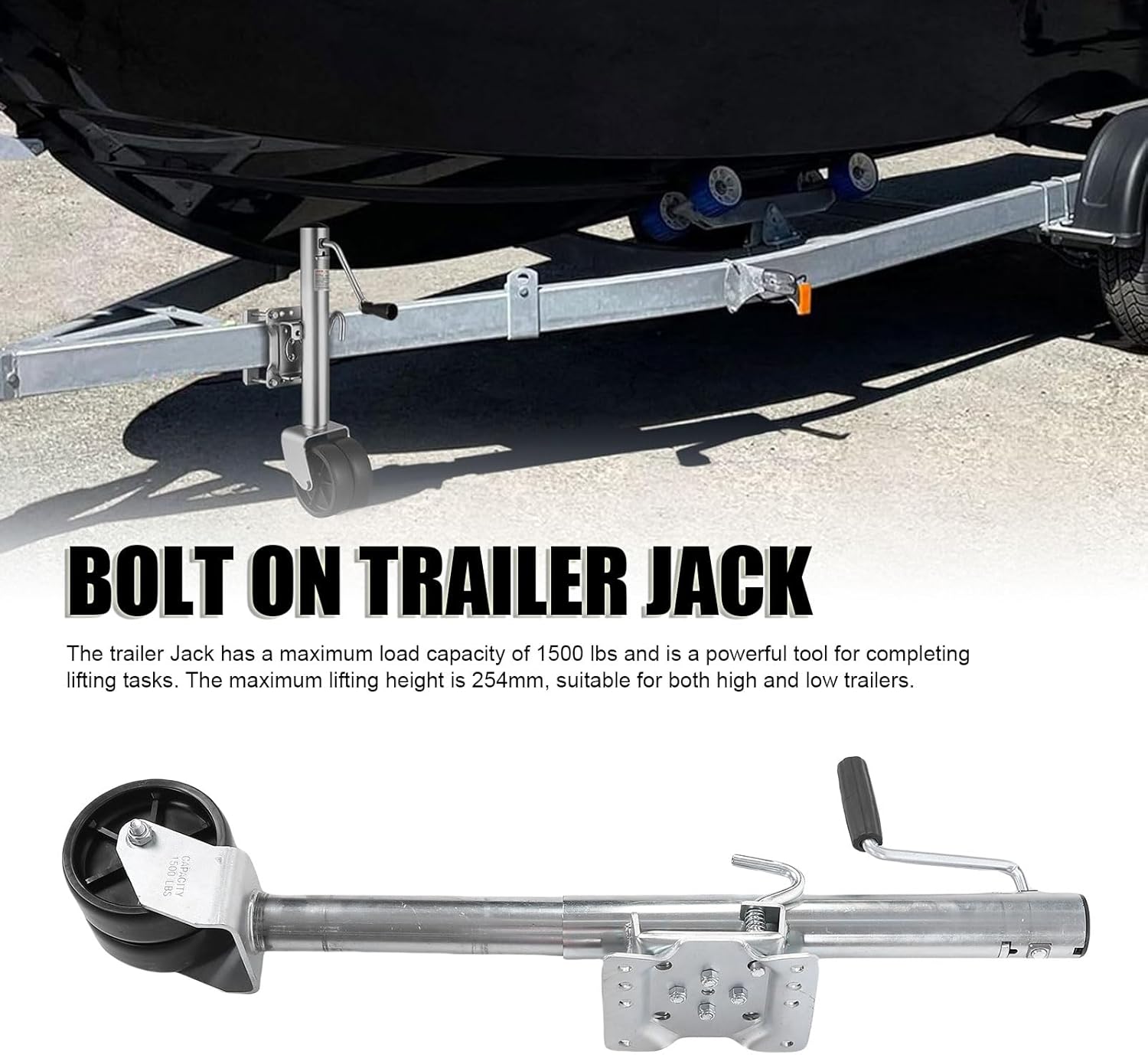 Spec: Item Type: Heavy Duty Trailer Jack Material: Steel + PP Capacity: 1500 lbs Lift Range: Approx. 254mm / 10in (Minimum Height: 620mm / 24.41in, Maximum Height: 874mm / 34.41in) Wheel Diameter: Approx. 147mm / 5.79in Application: RV, Boat, Horse Trailer, Utility Trailer PackageList: 1 x Trailer Jack 6 x Installation Accessories Notice: Before purchasing, please check the product dimensions as they are key to compatibility! Product dimensions are hand measured, please allow for small errors.