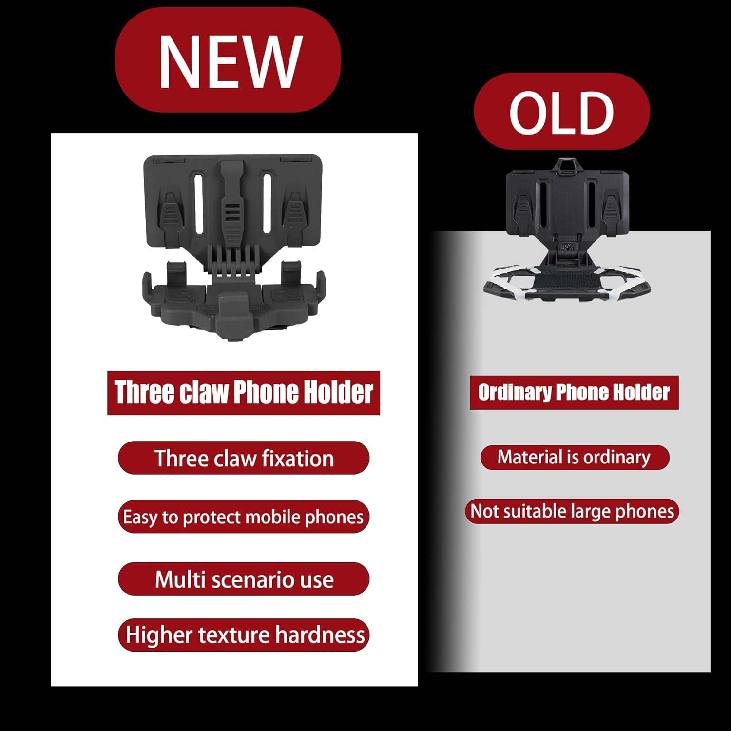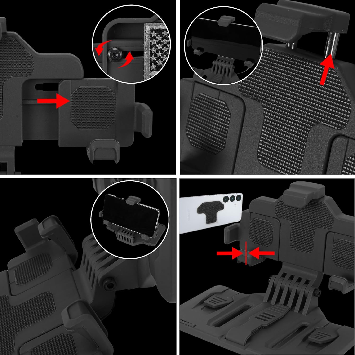 Tactical phone holder is made of nylon+TPE+silicone rubber ,with wear- resistan, lightweight,and high-quality.Molle phone holder have 5 colors are available, they are Black, Coyote Brown, Ranger Green,CP,MCBK.Plate carrier phone mount as swift, steadfast, and powerful as a falcon, it meets your higher demands Unlike old-style tactical MOLLE mounts, our upgraded version comes with built-in tightening screws and a hex key—specifically engineered to support large, heavy phones without wobbling, even when the holder is open during intense movement. Whether you’re running, climbing, or engaging in dynamic operations, this mount stays rock-solid, giving you 100% confidence that your device stays in place 6.0"-7.7" Devices & All MOLLE Vests: Fits all large smartphones and electronic devices from 6.0" to 7.7" (Mount Size: 6.22" L × 3.27" W × 2.5", Weight: 7.3 oz)—no need to worry about your phone being too big or heavy. Seamlessly works with police vests, plate carriers, tactical vests, and chest rigs. Best of all, it won’t block side fingerprint scanners or volume buttons, ensuring full functionality of your device while mounted Features 5 claw-style hooks that clamp your device like an eagle’s talons—far more secure than old 4-silicone-strip designs. 3 non-slip silicone strips lock tightly onto MOLLE webbing for enhanced durability, while the Velcro panel keeps firm contact with your phone, minimizing accidental drops during missions or sports Perfect for patrol, range training, hunting, hiking, cycling, desk work, and video watching. Flip the panel to instantly turn it into a car GPS mount or desktop stand—one mount for all your needs, indoors and outdoors