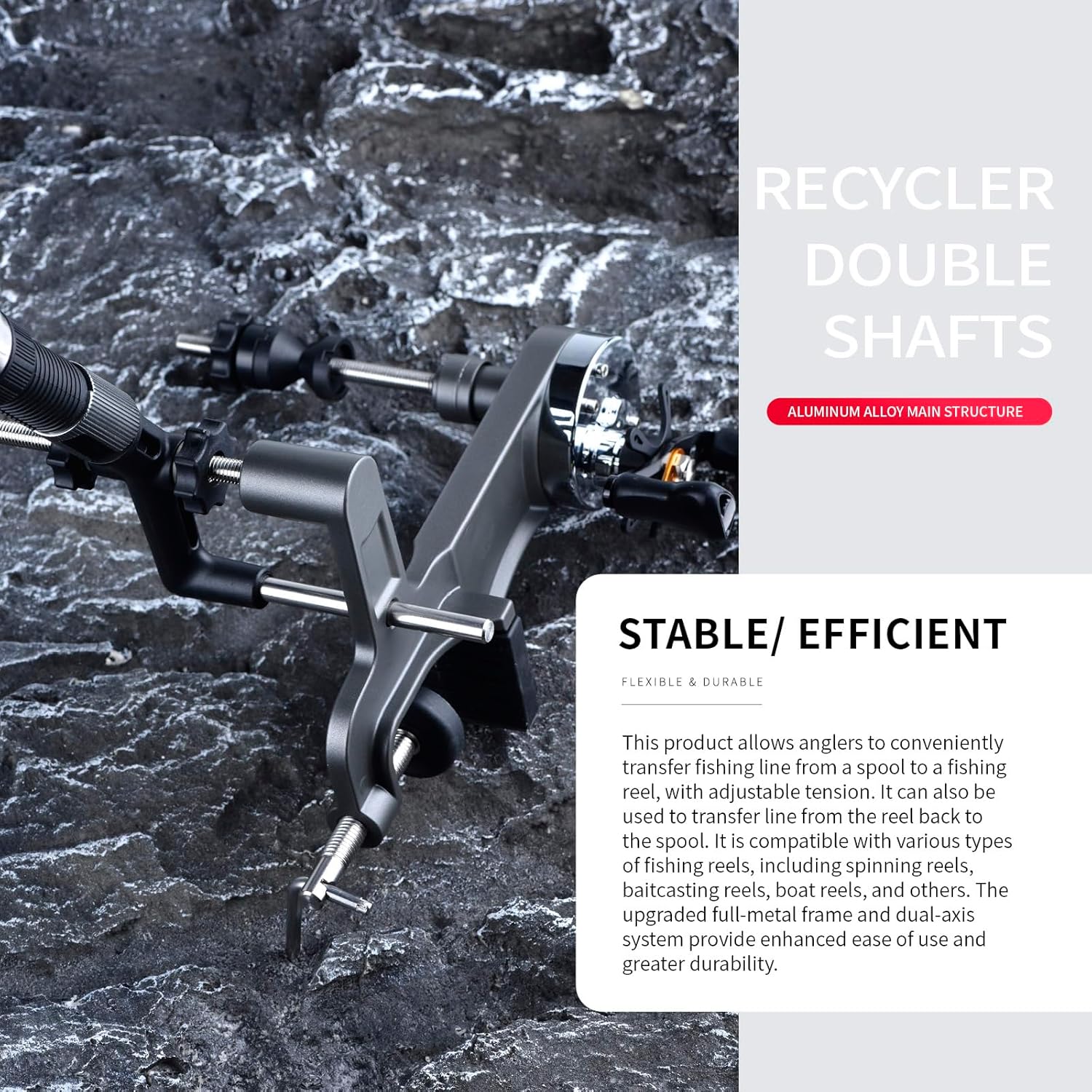 【Double Axis Design】: This fishing line winder features a double axis structure, ensuring smoother and more stable spooling and unwinding operations, effectively reducing the occurrence of line tangles【All Metal Construction】: Fishing Line Spooler Winder crafted with a full metal body coated with rust resistant material, offering a sleek matte finish for enhanced durability and longevity【Adjustable Drag System】: Fishing Line Spooling System equipped with an adjustable drag mechanism, allowing users to easily modify the tension to suit their specific fishing needs【Non Slip Rubber Base】: Fishing Reel Winder Includes a rubber anti slip pad that secures the device firmly on surface, avoiding any unwanted movement or shaking during use【Quick Line Change Feature】: Designed for efficiency, this fishing line winding tool allows users to swiftly change fishing lines, saving both time and effort during setup or maintenanceSpecification:Material: MetalSpeed ratio: 4.5:1Braking force: 760gUpper screw: 105mm/4.13inchLower screw: 115mm/4.53inchMaximum clamping distance: 45mm/1.77inchPackage Includes:1 Fishing Line Spooler