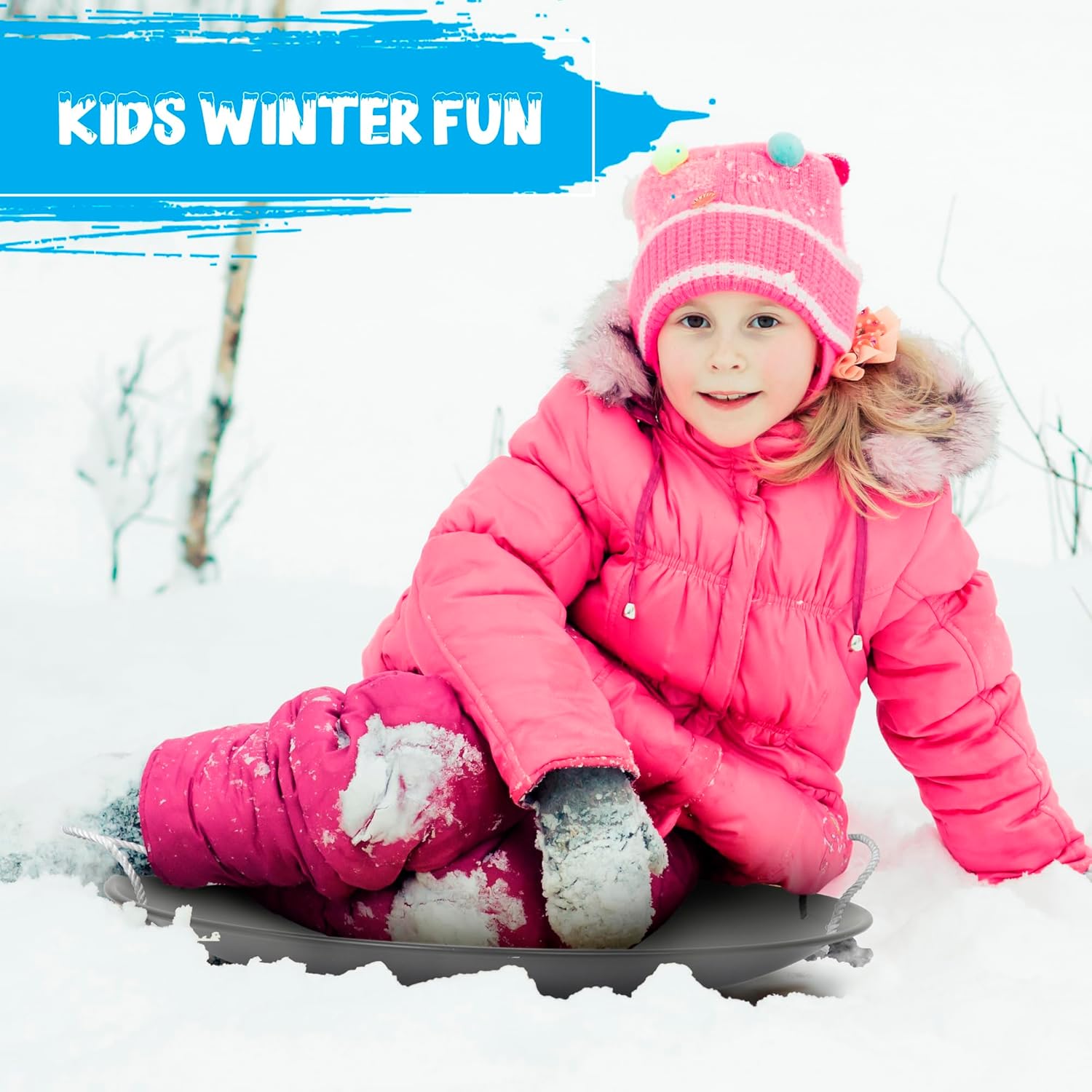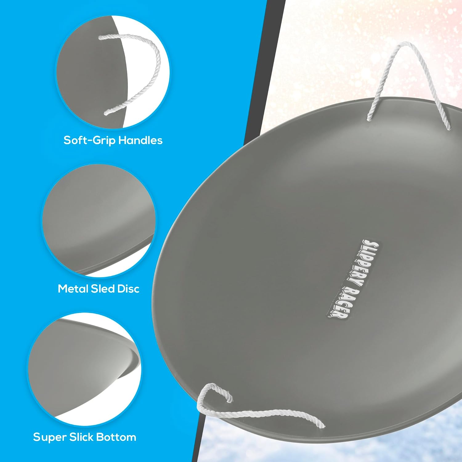 It's a snow day and the kids are buzzing about having some wintertime fun. Break out the Slippery Racer ProDisc 26 Inch Metal Saucer Sled and head for the hills for some classic sledding action. This metal disc sled is built with an enduring aluminum/iron alloy to create excellent sledding memories year after year. This classically designed saucer sled is equipped with 2 secure grip rope handles and a glossy base for swift and maneuverable rides down the powdery hills. The handles make carrying this disc back up the hill effortless as well as allowing you or your kiddos to don it as a shield for outstanding protection in impromptu snowball fights. Coated with a layer of vibrant paint you will easily be able to spot your sled among the others at the sled hill after you break for some hot chocolate. You can't go wrong with the Slippery Racer ProDisc 26 Inch Metal Saucer Sled as its a great go-to sled for beginners and seasoned pros alike.