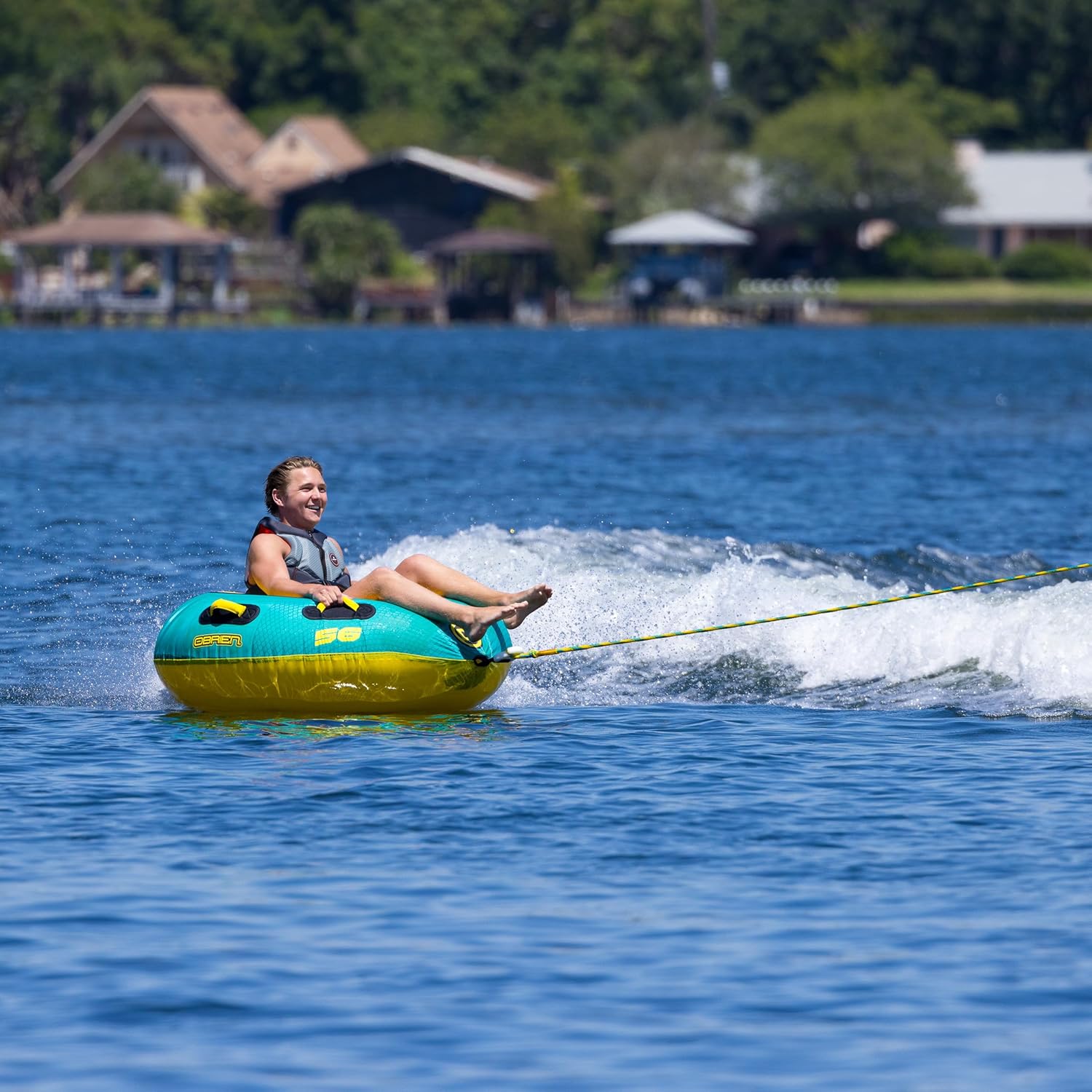 The O'Brien LeTube Towable Tube delivers classic tubing fun with its iconic donut-style design that’s been a favorite for over 25 years. Built tough with a 24-gauge PVC bladder and a durable 420-denier nylon partial cover, it withstands countless rides while keeping you comfortable and secure. The advanced Lightning Valve allows for inflation and deflation up to 57% faster than standard valves, so you can spend more time on the water. Four padded handles with EVA knuckle guards provide a firm, cushioned grip, and the quick-connect tow hook makes setup fast and reliable. Measuring 56 inches in diameter and supporting riders up to 170 lbs, this 1-person tube is compact, durable, and perfect for endless summer thrills on the water.