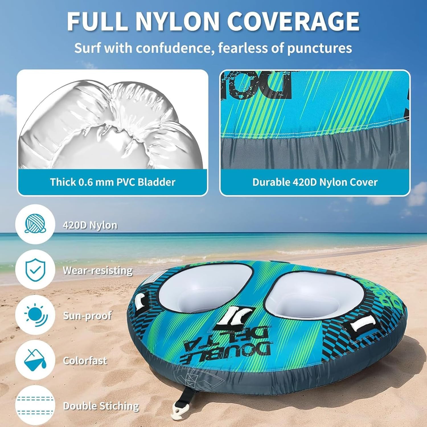 Enhance your time at the lake, beach, or river with a boat tube that combines a large profile with a portable build for maximum convenience. The wear-resistant quality has longevity through activities like swimming, fishing, kayaking, waterskiing, wakeboarding, and rafting. Designed to meet the needs of watersports fans, this boat tube ensures endless fun whether you're in a pool or out on open waters.Specification:Product Size:Double-player: about 127x178x6cm/50x70.08x2.36 inchesSingle-player: about 122x122x6cm/48.03x48.03x2.36 inchesSuitable for: children, teenagers or adultsFeatures:Equipped with soft joint pads to ensure a bump-free rideSafety first design-equipped with 4 neoprene handles and reinforced traction rings sewn at multiple stress points to provide a firm grip and stability during high-speed tractionProduct List:1 * Single Person Boat TubeOr1 * Double Person Boat TubeNotes: Due to different lighting and screen settings, the product color may be slightly different from the picture.Due to the difference in manual measurement, please allow a 1-3cm difference in size.