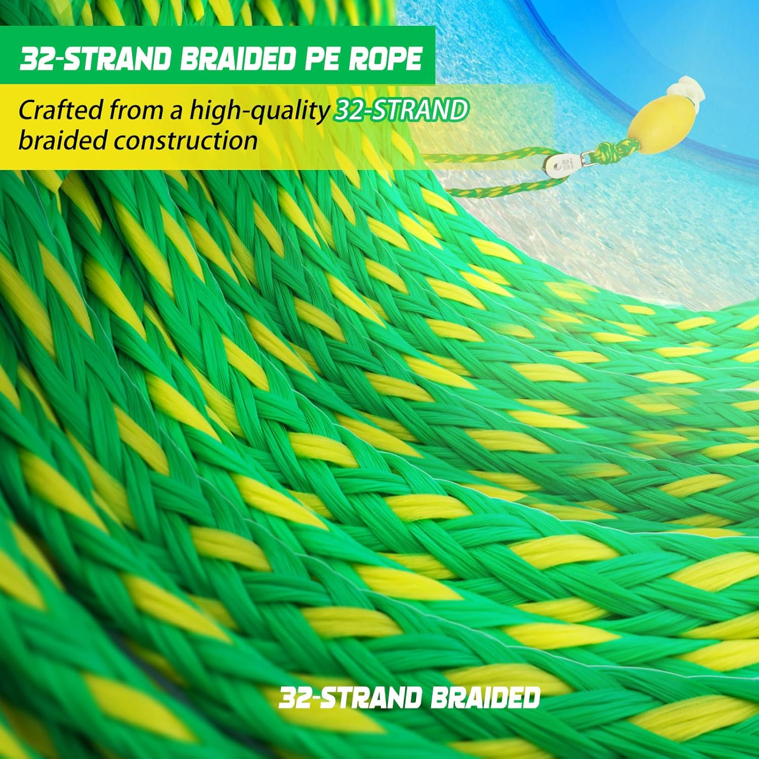 | Additional Features | 32-strand braided rope offers 5000 lbs break strength, Floating capability and visible colour, Heavy-duty towing for 1-4 riders towable tubes, Large 304 stainless steel hooks, Self-centering pulley for stable towing |