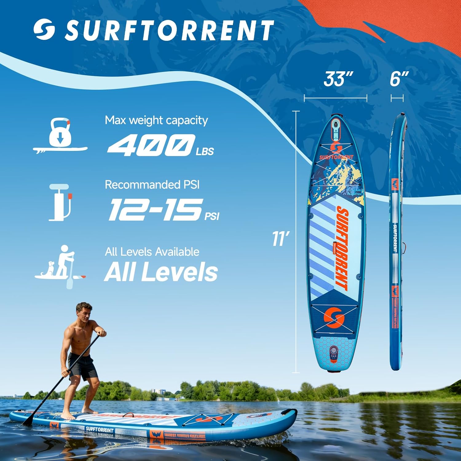 Surftorrent 11'x33" Inflatable Stand Up Paddle Board Experience water adventures with confidence and ease on the Surftorrent premium inflatable SUP. Its extra-wide 33" design and three-fin system deliver superior stability and tracking for paddlers of all levels—from beginners to yoga enthusiasts and anglers. Built with military-grade PVC for durability and weighing only 17.8 lbs, it packs easily into the included backpack for true portability. The board features 14 reinforced D-rings and a front mount for adding accessories like a kayak seat or camera. Everything you need is included: adjustable paddle, fins, pump, safety leash, phone pouch, and repair kit. We stand behind your adventure with 24/7 support, a 30-day return guarantee, and extended warranties. Dive in, explore freely, and own the water with Surftorrent. Surftorrent exists for one purpose: to set you free on the water. Our paddle boards are built for adventure—stable enough for first-timers yet ready for whatever you discover. it’s the tool that turns distant coastlines into your personal playground. We include everything you need to launch your journey. This is more than a board; it’s your invitation to own the horizon.